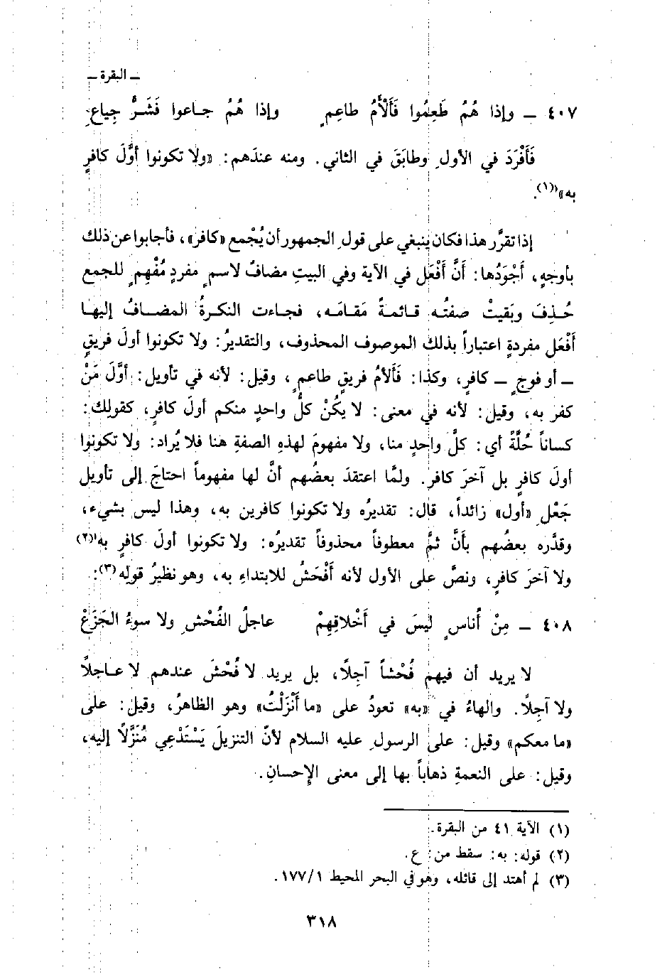 إذا تقرَّر هذا فكان ينبغي على قولِ الجمهور أن يُجْمع «كافر» ، فأجابوا عن ذلك بأوجهٍ: أَجْوَدُها: أَنَّ أَفْعَل في الآية وفي البيتِ مضافٌ لاسمٍ مفردٍ مُفْهِمٍ للجمع حُذِفَ وبَقيتْ صفتُه قائمةً مَقامَه، فجاءت النكرةُ المضافُ إليها أفْعَل مفردةٍ اعتباراً بذلك الموصوف المحذوف، والتقديرُ: ولا تكونوا أولَ فريقٍ أو فوجٍ كافرٍ، وكذا: فَالأَمُ فريقٍ طاعمٍ، وقيل: لأنه في تأويل: أوَّلَ مَنْ كفر به، وقيل: لأنه في معنى: لا يكُنْ كلُّ واحدٍ منكم أولَ كافرٍ، كقولِك: كساناً حُلَّةً أي: كلَّ واحدٍ منا، ولا مفهومَ لهذهِ الصفةِ هنا فلا يُراد: ولا تكونوا أولَ كافرٍ بل آخرَ كافر. ولمَّا اعتقدَ بعضُهم أنَّ لها مفهوماً احتاجَ إلى تأويل جَعْلِ «أول» زائداً، قال: تقديرُه ولا تكونوا كافرين به، وهذا ليس بشيء، وقدَّره بعضُهم بأَنَّ ثمَّ معطوفاً محذوفاً تقديرُه: ولا تكونوا أولَ كافرٍ به ولا آخرَ كافرٍ، ونصَّ على الأول لأنه أَفْحَشُ للابتداءِ به، وهو نظيرُ قولِه: