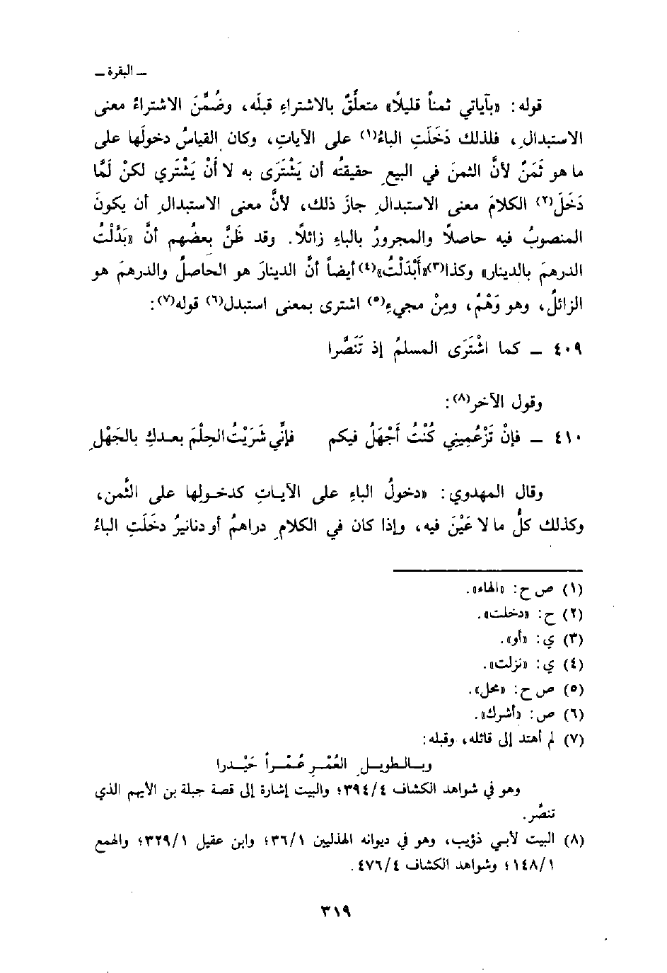 قوله: {بِآيَاتِي ثَمَناً قَلِيلاً} متعلِّقٌ بالاشتراءِ قبلَه، وضُمِّنَ الاشتراءُ معنى الاستبدالِ، فلذلك دَخَلَتِ الباءُ على الآياتِ، وكان القياسُ دخولَها على ما هو ثَمَنٌ لأنَّ الثمنَ في البيعِ حقيقتُه أن يَشْتَرَى به لا أَنْ يَشْتَري لكنْ لَمَّا دَخَلَ الكلامَ معنى الاستبدالِ جازَ ذلك، لأنَّ معنى الاستبدالِ أن يكونَ المنصوبُ فيه حاصلاً والمجرورُ بالباءِ زائلاً. وقد ظَنَّ بعضُهم أنَّ «بَدَّلْتُ الدرهمَ بالدينار» وكذا «أَبْدَلْتُ» أيضاً أنَّ الدينارَ هو الحاصلُ والدرهمَ هو الزائلُ، وهو وَهْمٌ، ومِنْ مجيءِ اشترى بمعنى استبدل قوله: