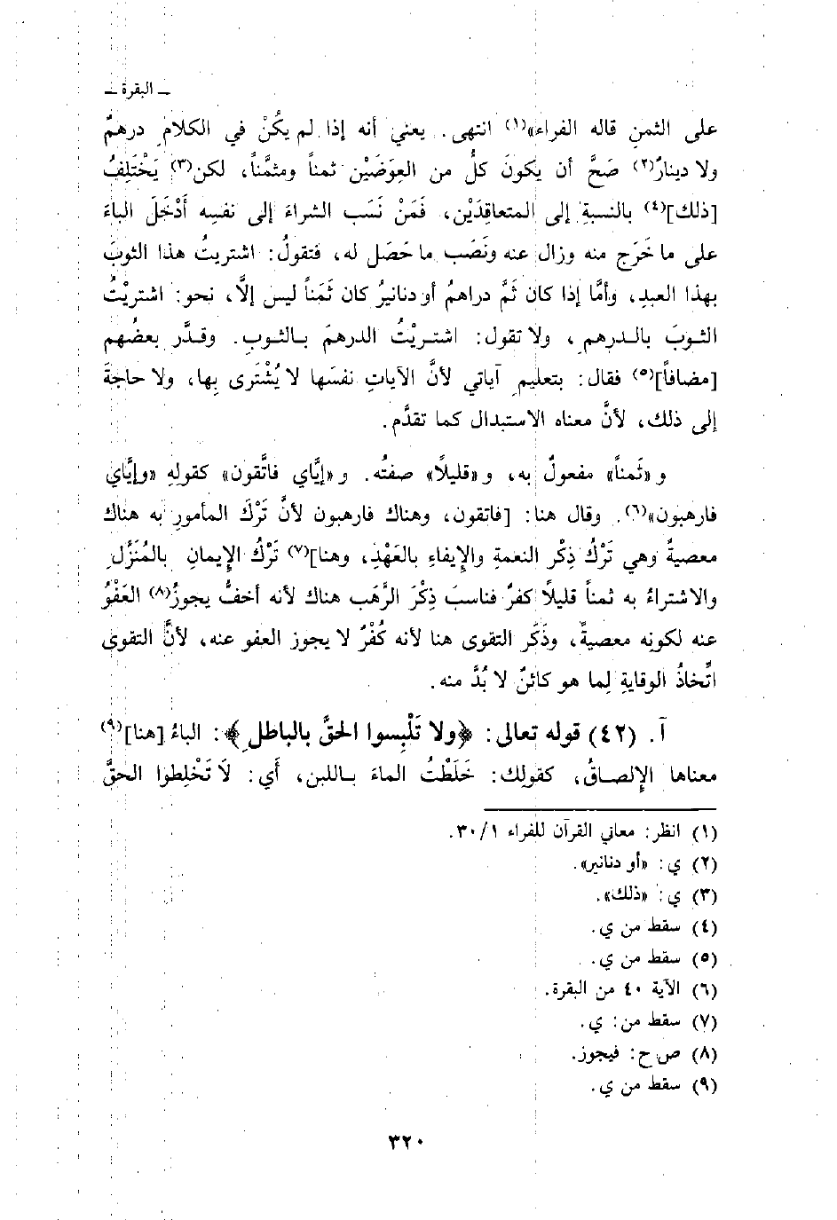 و «ثَمناً» مفعولٌ به، و «قليلاً» صفتُه. و {وَإِيَّايَ فاتقون} كقوله {وَإِيَّايَ فارهبون} [البقرة: 40] . وقال هنا: [فاتقون، وهناك فارهبون لأنَّ تَرْكَ المأمورِ به هناك معصيةٌ وهي تَرْكُ ذِكْر النعمةِ والإِيفاءِ بالعَهْدِ، وهنا] تَرْكُ الإِيمانُ بالمُنَزَّلِ والاشتراءُ به ثمناً قليلاً كفرٌ فناسبَ ذِكْرَ الرَّهَب هناك لأنه أخفُّ يجوزُ العَفْوُ عنه لكونِه معصيةً، وذَكَر التقوى هنا لأنه كُفْرٌ لا يجوز العفو عنه، لأنَّ التقوى اتِّخاذُ الوقايةِ لِما هو كائنٌ لا بُدَّ منه.