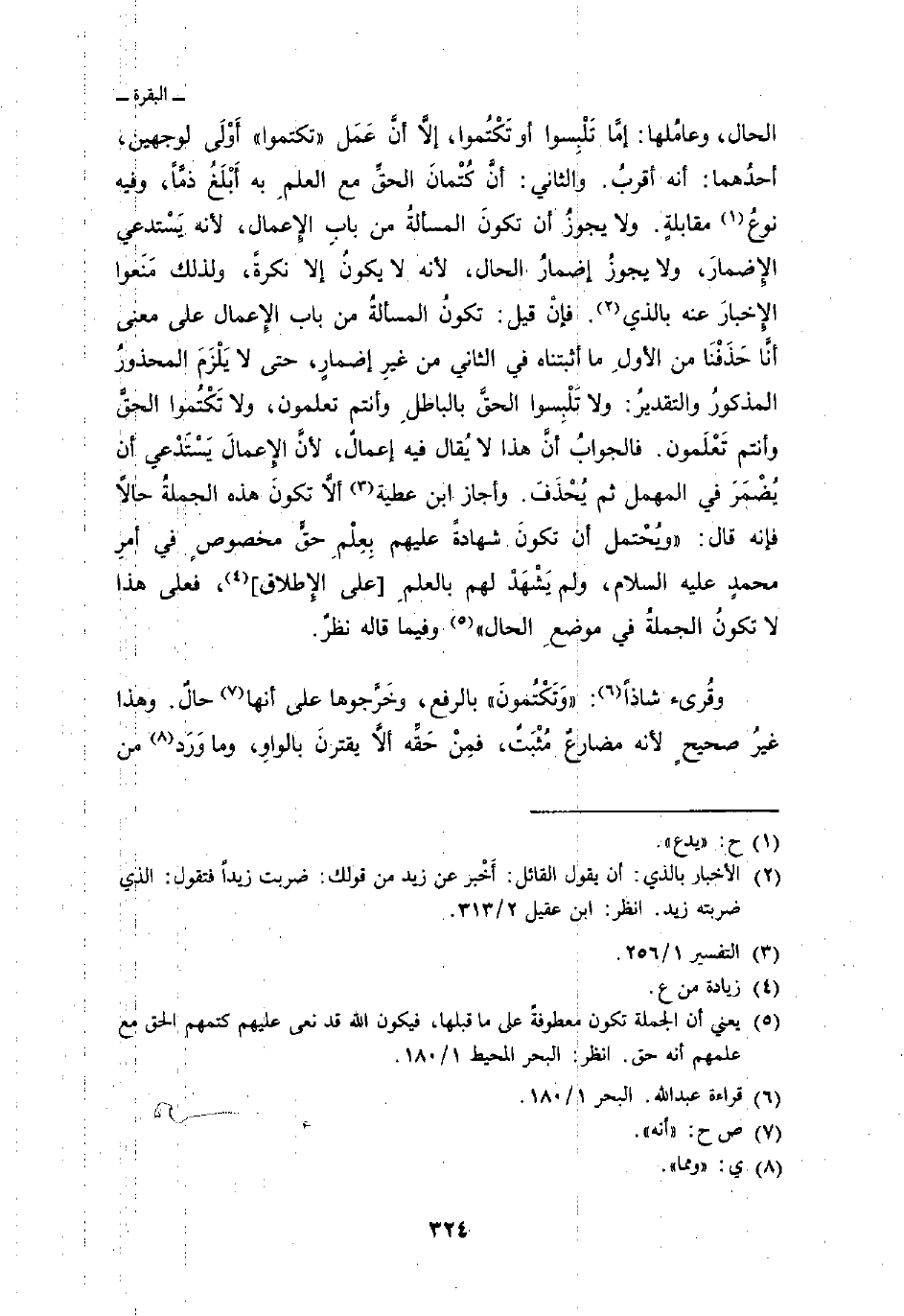 الحال، وعامُلها: إمَّا تَلْبِسوا أو تَكْتُموا، إلاَّ أنَّ عَمَل «تكتموا» أَوْلَى لوجهين، أحدُهما: أنه أقربُ. والثاني: أنَّ كُتْمانَ الحقِّ مع العلمِ به أَبْلَغُ ذمَّاً، وفيه نوعُ مقابلةٍ. ولا يجوزُ أن تكونَ المسألةُ من بابِ الإِعمال، لأنه يَسْتدعي الإِضمارَ، ولا يجوزُ إضمارُ الحال، لأنه لا يكونُ إلا نكرةً، ولذلك مَنَعوا الإِخبارَ عنه بالذي. فإنْ قيل: تكونُ المسألةُ من باب الإِعمال على معنى أنَّا حَذَفْنَا من الأولِ ما أثبتناه في الثاني من غيرِ إضمارٍ، حتى لا يَلْزَمَ المحذورُ المذكورُ والتقديرُ: ولا تَلْبِسوا الحقَّ بالباطلِ وأنتم تعلمون، ولا تَكْتُموا الحقَّ وأنتم تَعْلَمون. فالجوابُ أنَّ هذا لا يُقال فيه إعمالٌ، لأنَّ الإِعمالَ يَسْتَدْعي أن يُضْمَرَ في المهمل ثم يُحْذَفَ. وأجاز ابن عطية ألاَّ تكونَ هذه الجملةُ حالاً فإنه قال: «ويُحْتمل أن تكونَ شهادةً عليهم بِعِلْمِ حقٍّ مخصوصٍ في أمرِ محمدٍ عليه السلام، ولم يَشْهَدْ لهم بالعلمِ [على الإِطلاق] ، فعلى هذا لا تكونُ الجملةُ في موضعِ الحال» وفيما قاله نظرٌ.