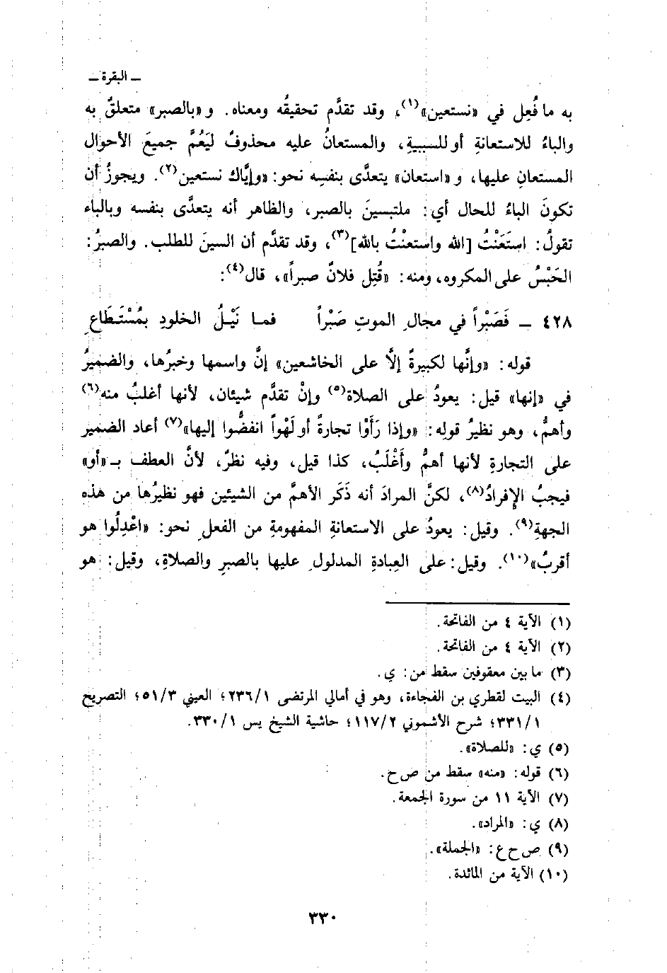 به ما فُعِل في {نَسْتَعِينُ} [الفاتحة: 5] ، وقد تقدَّم تحقيقُه ومعناه. «وبالصبر» متعلقٌ به والباءُ للاستعانةِ أو للسببيةِ، والمستعانُ عليه محذوفٌ ليَعُمَّ جميعَ الأحوال المستعانِ عليها، و «استعان» يتعدَّى بنفسِه نحو: {وَإِيَّاكَ نَسْتَعِينُ} [الفاتحة: 5] . ويجوز أن تكونَ الباءُ للحال أي: ملتبسينَ بالصبر، والظاهر أنه يتعدَّى بنفسه وبالباء تقولُ: استَعَنْتُ [الله واستعنْتُ بالله] وقد تقدَّم أن السينَ للطلب. والصبرُ: الحَبْسُ على المكروه، ومنه: «قُتِل فلانٌ صبراً» ، قال: