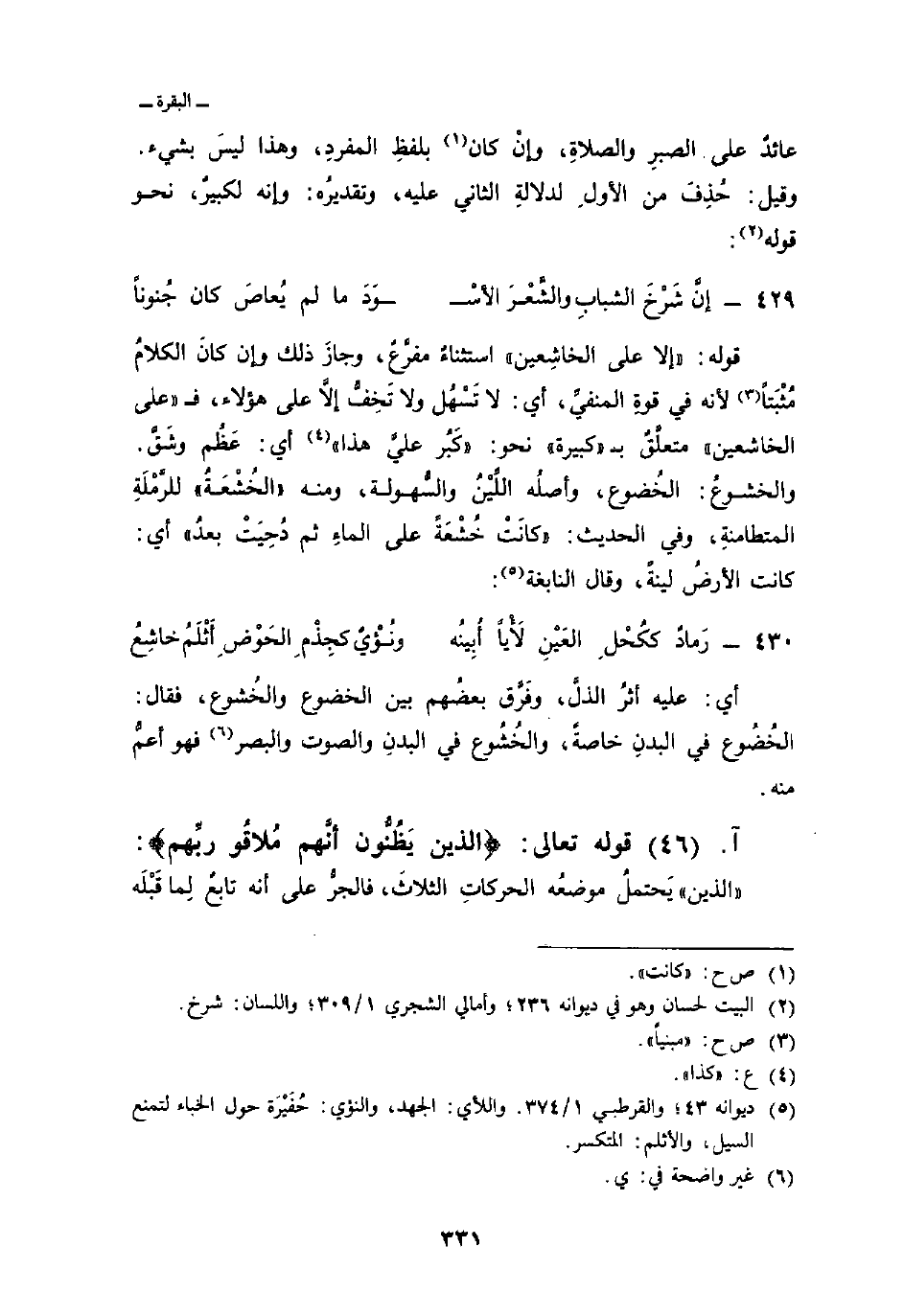 قوله: {إِلاَّ عَلَى الخاشعين} استثناءٌ مفرَّعٌ، وجازَ ذلك وإن كانَ الكلامُ مُثْبَتاً لأنه في قوةِ المنفيِّ، أي: لا تَسْهُل ولا تَخِفُّ إلاَّ على هؤلاء، ف «على الخاشعين» متعلَّقٌ ب «كبيرة» نحو: «كَبُر عليَّ هذا» أي: عَظُم وشَقَّ. والخشوعُ: الخُضوع، وأصلُه اللِّيْنُ والسُّهولة، ومنه «الخُشْعَةُ» للرَّمْلَةِ المتطامنةِ، وفي الحديث: «كانَتْ خُشْعَةً على الماءِ ثم دُحِيَتْ بعدُ» أي: كانت الأرضُ لينةً، وقال النابغة: