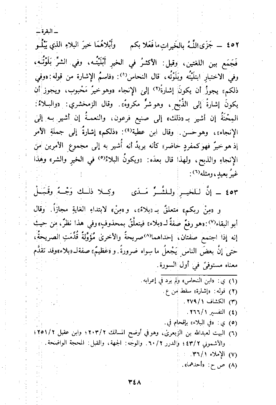 فَجَمَع بين اللغتين، وقيل: الأكثرُ في الخيرِ أَبْلَيْتُه، وفي الشرِّ بَلَوْتُه، وفي الاختبارِ ابتلَيْتُه وبَلَوْتُه، قال النحاس: «فاسمُ الإِشارة من قوله:» وفي ذلكم «يجوزُ أن يكونَ إشارةً إلى الإِنجاءِ» وهو خيرٌ مَحْبوب، ويجوز أن يكونَ إشارةً إلى الذَّبْحِ، وهو شرٌّ مكروهٌ «. وقال الزمخشري:» والبلاءُ: المِحْنَةُ إنْ أشير ب «ذلك» إلى صنيع فرعون، والنعمةُ إن أُشير به إلى الإِنجاء «، وهو حسن. وقال ابن عطية:» ذلكم «إشارةٌ إلى جملةِ الأمر إذ هو خيرٌ فهو كمفردٍ حاضر» كأنه يريدُ أنه أُشير به إلى مجموعِ الأمرين من الإِنجاءِ والذبح، ولهذا قال بعدَه: «ويكونُ البلاءُ في الخيرِ والشر» وهذا غيرُ بعيدٍ، ومثله:
