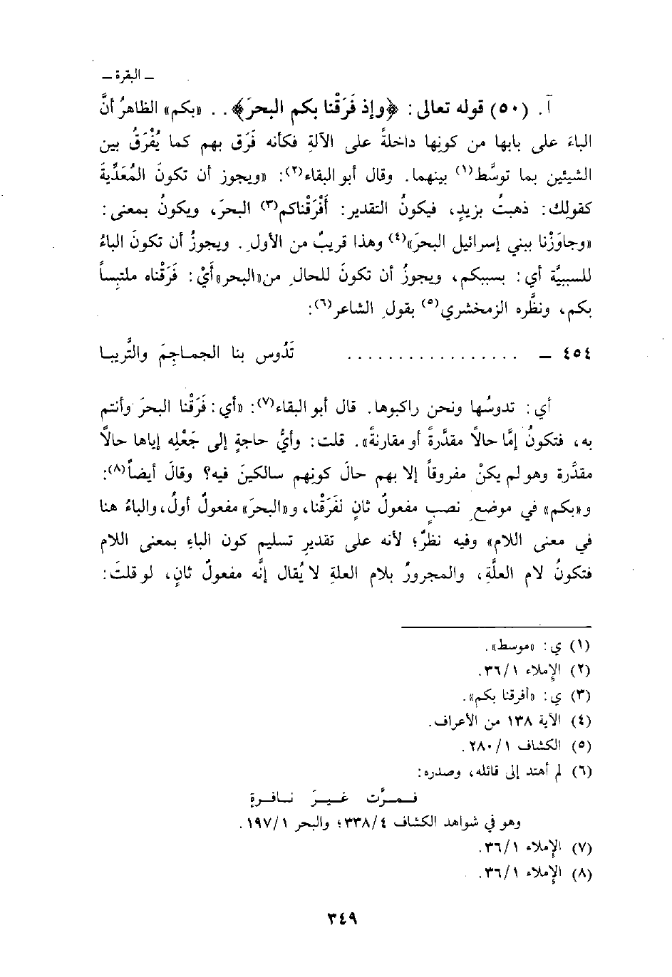 قوله: {وَإِذْ فَرَقْنَا بِكُمُ البحر} . . «بكم» الظاهرُ أنَّ الباءَ على بابها من كونِها داخلةً على الآلةِ فكأنه فَرَق بهم كما يُفْرَقُ بين الشيئين بما توسَّط بينهما. وقال أبو البقاء: «ويجوز أن تكون المُعَدِّيةَ كقولِك: ذهبتُ بزيدٍ، فيكونُ التقدير: أَفْرَقْناكم البحرَ، ويكونُ بمعنى: {وَجَاوَزْنَا ببني إِسْرَآئِيلَ البحر} [الأعراف: 138] وهذا قريبٌ من الأولِ. ويحوزُ أن تكونَ الباءُ للسببيَّة أي: بسببكم، ويجوزُ أن تكونَ للحالِ من» البحر «أَيْ: فَرَقْناه ملتبِساً بكم، ونظَّره الزمخشري بقولِ الشاعر: