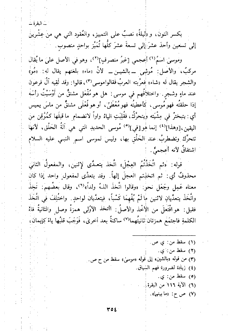 واختلافُهم في موسى: هل هو مُفْعَل مشتقٌّ من أَوْسَيْتُ رأسَه إذا حلقتُه فهو مُوسى، كأعطيتُه فهو مُعْطَىً، أو هو فُعْلَى مشتقٌّ من ماسَ يميس أي: يتبخترُ في مِشْيَته ويتحرَّكُ، فقُلِبَتِ الياءُ واواً لانضمامِ ما قبلَها كمُوْقِن من اليقين، [وهذا] إنما هو [في] مُوسى الحديدِ التي هي آلةُ الحَلْق، لأنها تتحرَّك وتضطربُ عند الحَلْقِ بها، وليس لموسى اسمِ النبي عليه السلام اشتقاقٌ لأنه أعجميٌّ.