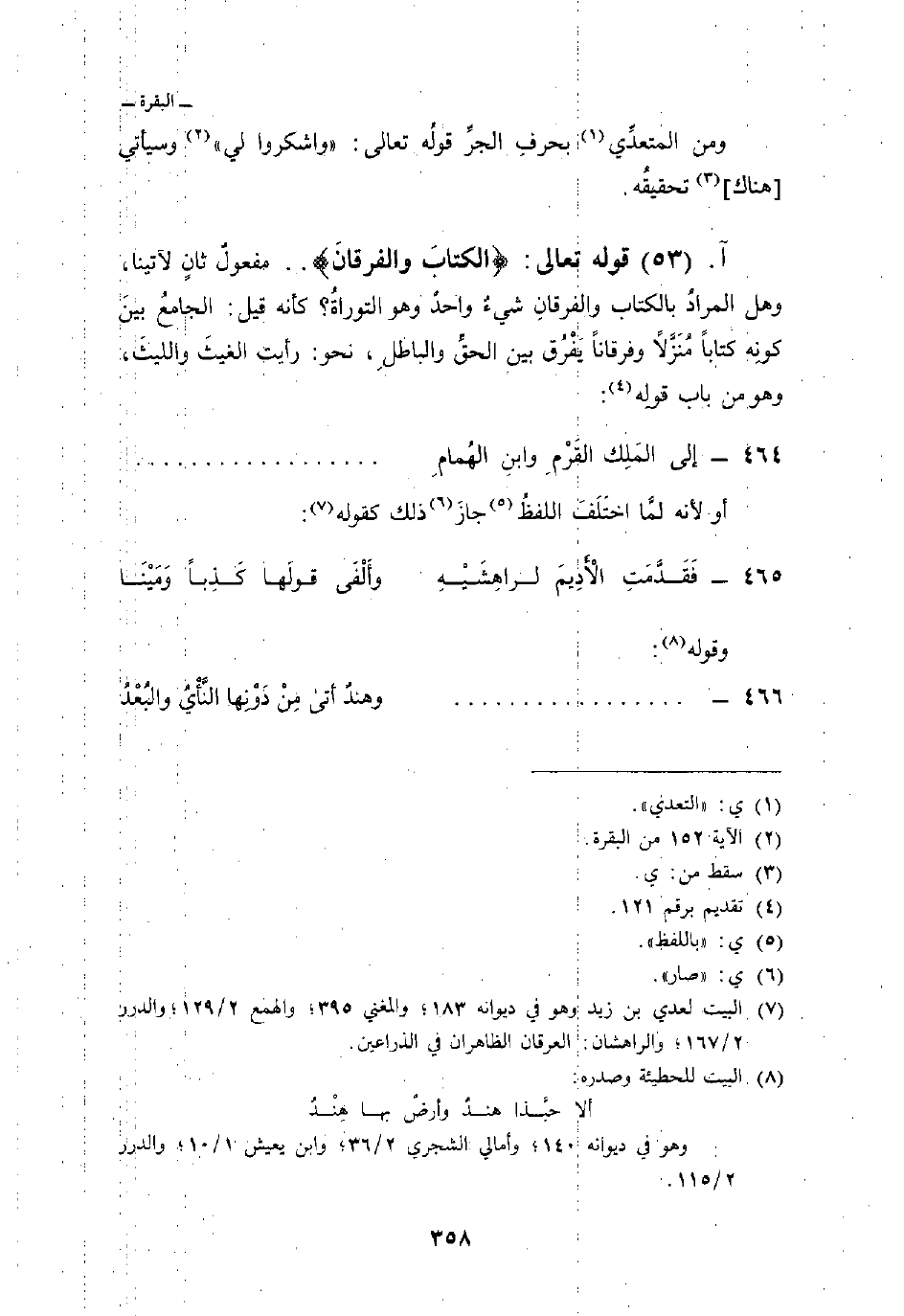 قوله تعالى: {الكتاب والفرقان} . . مفعولٌ ثانٍ لآتينا، وهل المرادُ بالكتاب والفرقانِ شيءٌ واحدٌ وهو التوراةُ؟ كأنه قيل: الجامعُ بينَ كونِه كتاباً مُنَزَّلاً وفرقاناً يَفْرُق بين الحقِّ والباطلِ، نحو: رأيت الغيثَ والليثَ، وهو من باب قولِه: