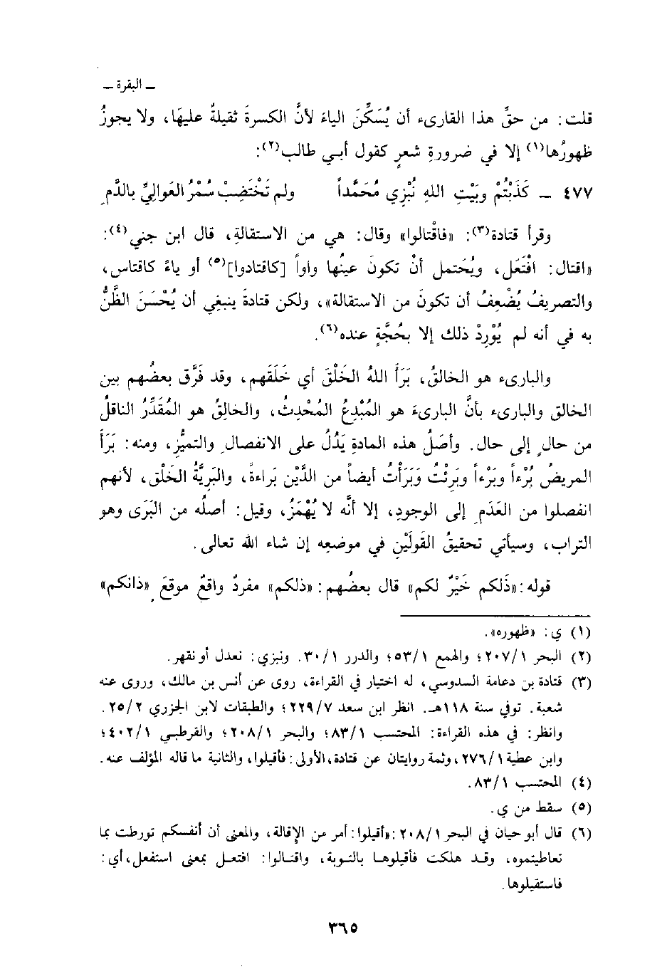 وقرأ قتادة: «فاقْتالوا» وقال: هي من الاستقالةِ، قال ابن جني: «اقتال: افْتَعَل، ويُحَتمل أنْ تكونَ عينُها واواً [كاقتادوا] أو ياءً كاقتاس، والتصريفُ يُضْعِفُ أن تكونَ من الاستقالة» ، ولكن قتادةَ ينبغِي أن يُحْسَنَ الظَّنُّ به في أنه لم يُوْرِدْ إلا بحُجَّةٍ عنده.