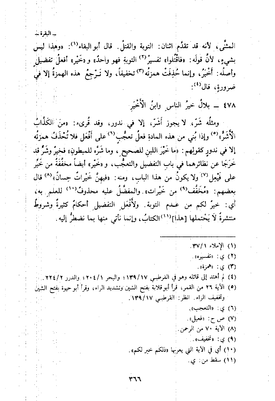 478 - بلالُ خيرُ الناسِ وابنُ الأَخْيَرِ ... ومثلُه شَرّ، لا يجوز أَشَرّ، إلا في ندور، وقد قُرىء: {مَن الكّذَّابُ الأَشَرُّ} [القمر: 26] وإذا بُني من هذه المادةِ فعلُ تعجُّبٍ على أَفْعَل فلا تُحْذَفُ همزتُه إلا في ندورٍ كقولِهم: «ما خَيْرَ اللبنِ للصحيحِ، وما شَرَّه للمبطونِ» فخيرٌ وشَرٌّ قد خَرَجَا عن نظائرهما في بابِ التفضيل والتعجُّب، و «خَيْر» أيضاً مخفَّفَةٌ من خَيَّر على فَيْعِل ولا يكونُ من هذا البابِ، ومنه: «فيهِنَّ خَيْراتٌ حِسانٌ» قال بعضهم: «مُخَفَّف من خَيِّرات» . والمفضَّلُ عليه محذوفٌ للعلمِ به، أي: خيرٌ لكم من عدم التوبة. ولأَفْعَلِ التفضيلِ أحكامٌ كثيرةٌ وشروطٌ منتشرةٌ لاَ يَحْتملها [هذا] الكتابُ، وإنما نأتي منها بما نضطرُّ إليه.