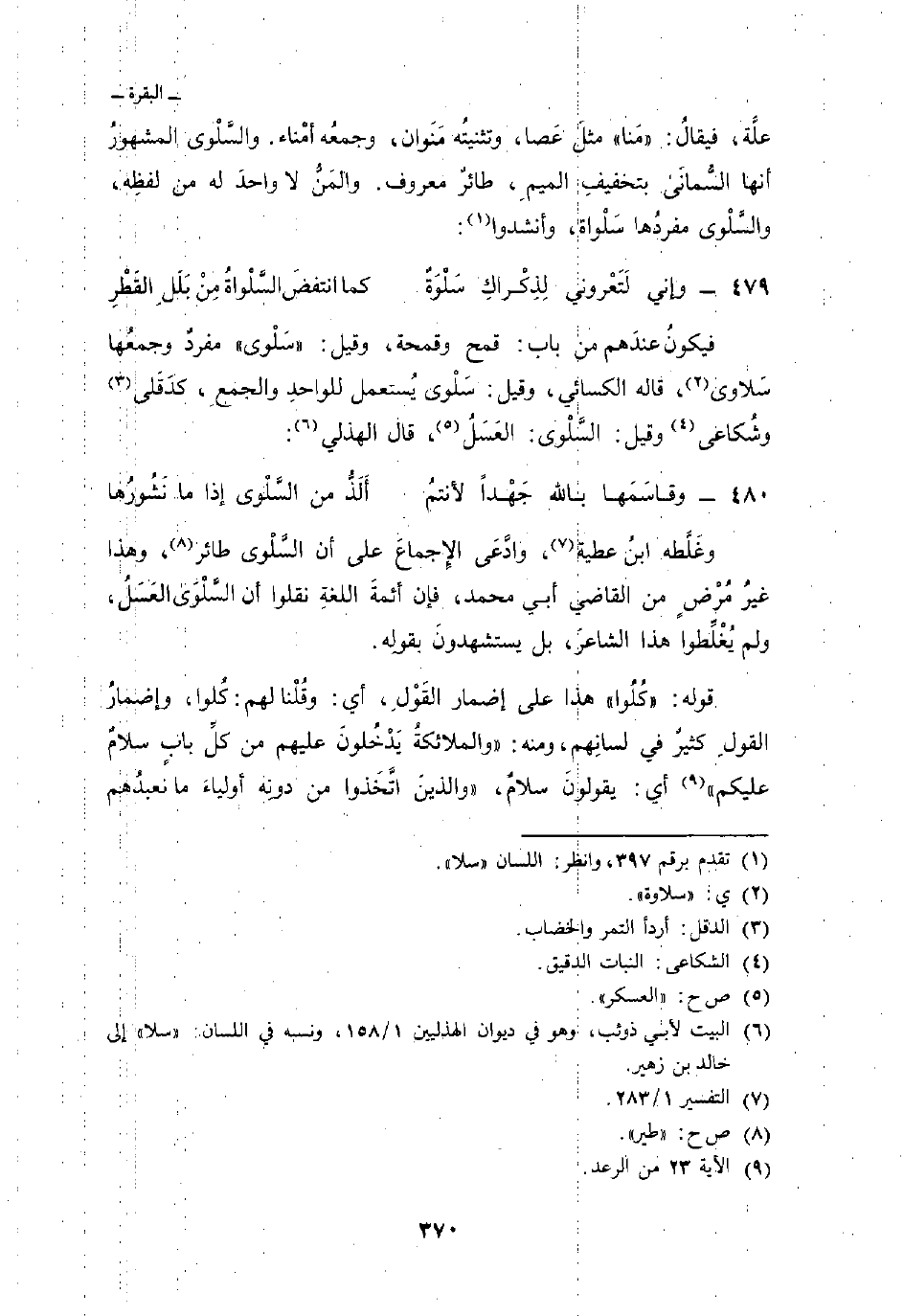 وغَلَّطه ابنُ عطية، وادَّعَى الإِجماعَ على أن السَّلْوى طائر، وهذا غيرُ مُرْضٍ من القاضي أبي محمد، فإن أئمةَ اللغةِ نقلوا أن السلوى العَسَلُ، ولم يُغْلِّطوا هذا الشاعرَ، بل يستشهدونَ بقولِه.
