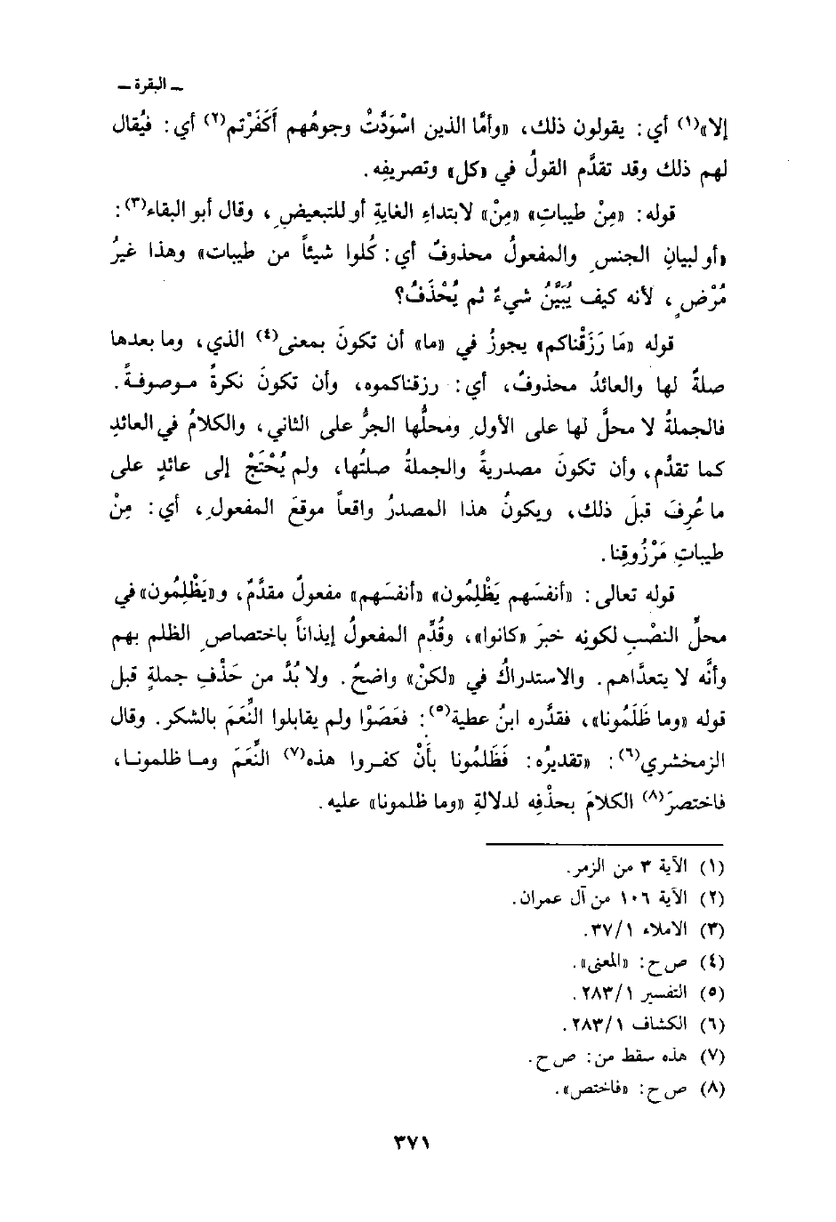 قوله تعالى: {أَنْفُسَهُمْ يَظْلِمُونَ} » أنفسَهم «مفعولٌ مقدَّمٌ، و» يَظْلِمُون «في محلِّ النصْبِ لكونِه خبرَ» كانوا «، وقُدِّم المفعولُ إيذاناً باختصاصِ الظلم بهم وأنَّه لا يتعدَّاهم. والاستدراكُ في» لكنْ «واضحٌ. ولا بُدَّ من حَذْفِ جملةٍ قبل قوله {وَمَا ظَلَمُونَا} ، فقدَّره ابنُ عطية: فَعَصَوْا ولم يقابلوا النِّعَمَ بالشكر. وقال الزمخشري:» تقديرُه: فَطَلمُونا بأَنْ كفروا هذه النِّعَمَ وما ظلمونا، فاختصرَ الكلامَ بحذْفِه لدلالةِ {وَمَا ظَلَمُونَا} عليه.