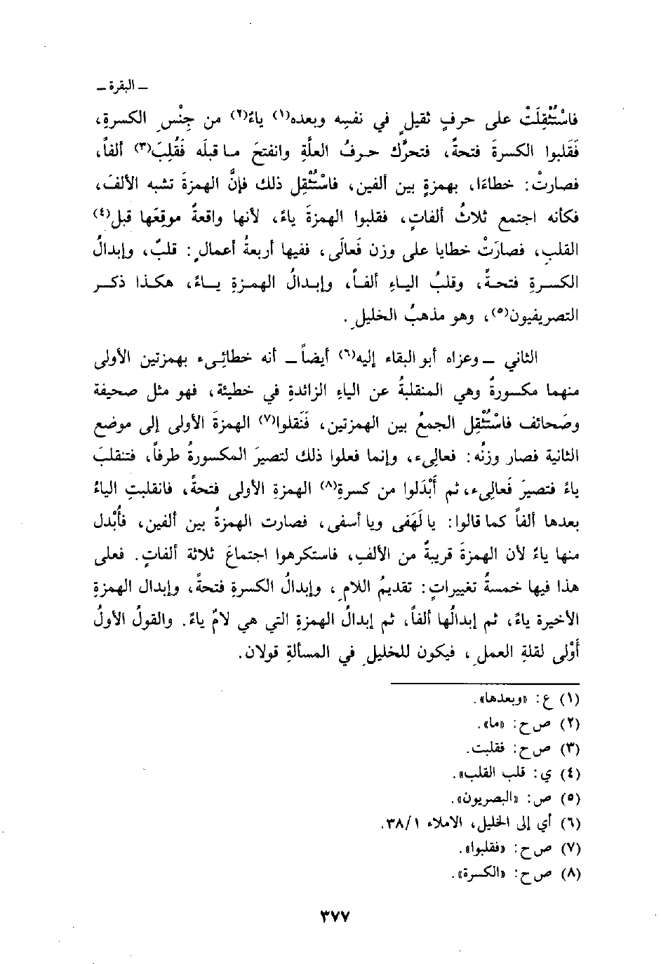 فاسْتُثْقِلَتْ على حرفٍ ثقيلٍ في نفسِه وبعده ياءٌ من جِنْسِ الكسرةِ، فَقَلبوا الكسرةَ فتحةً، فتحرَّك حرفُ العلَّةِ وانفتحَ ما قبلَه فَقُلِبَ ألفاً، فصارتْ: خطاءَا، بهمزةٍ بين ألفين، فاسْتُثْقِل ذلك فإنَّ الهمزةَ تشبه الألفَ، فكأنه اجتمع ثلاثُ ألفاتٍ، فقلبوا الهمزةَ ياءً، لأنها واقعةٌ موقِعَها قبل القلبِ، فصارَتْ خطايا على وزن فَعَالَى، ففيها أربعةُ أعمالٍ، قلبٌ، وإبدالُ الكسرةِ فتحةً، وقلبُ الياءِ ألفاً، وإبدالُ الهمزةِ ياءً، هكذا ذكر التصريفيون، وهو مذهبُ الخليلِ.