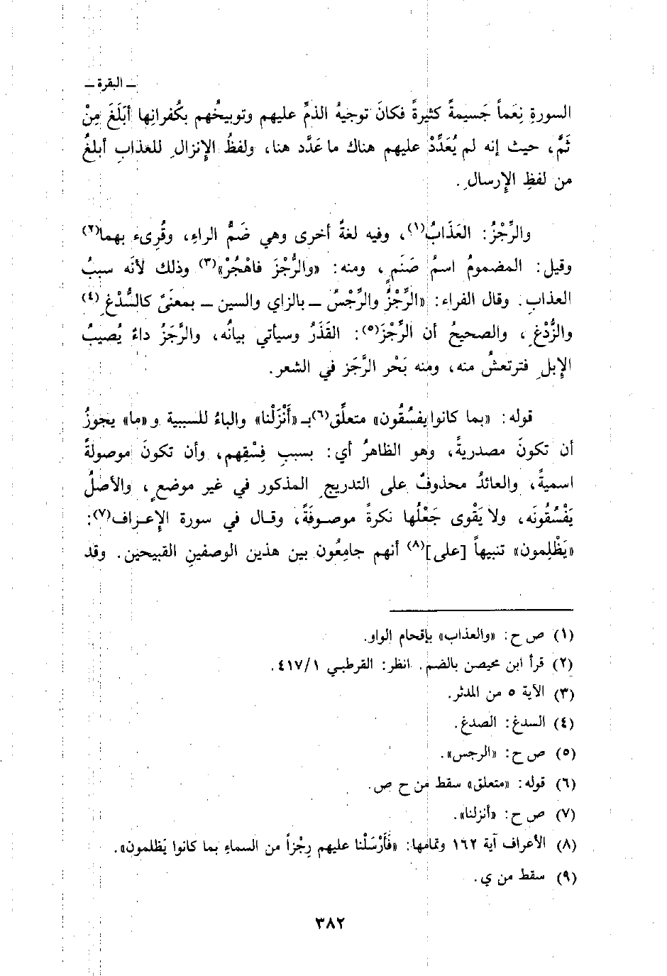 قوله:» بما كانوا يفسُقُون متعلِّق ب {أَنزَلْنَا} والباءُ للسببية و «ما» يجوزُ أن تكونَ مصدريةً، وهو الظاهرُ أي: بسببِ فِسْقِهم، وأن تكونَ موصولةً اسميةً، والعائدُ محذوفٌ على التدريجِ المذكور في غير موضعٍ، والأصلُ يَفْسُقُونَه، ولا يَقْوى جَعْلُها نكرةً موصوفَةً، وقال في سورة الإِعراف: {يَظْلِمُونَ} [الآية: 162] تنبيهاً [على] أنهم جامِعُون بين هذين الوصفينِ القبيحين. وقد