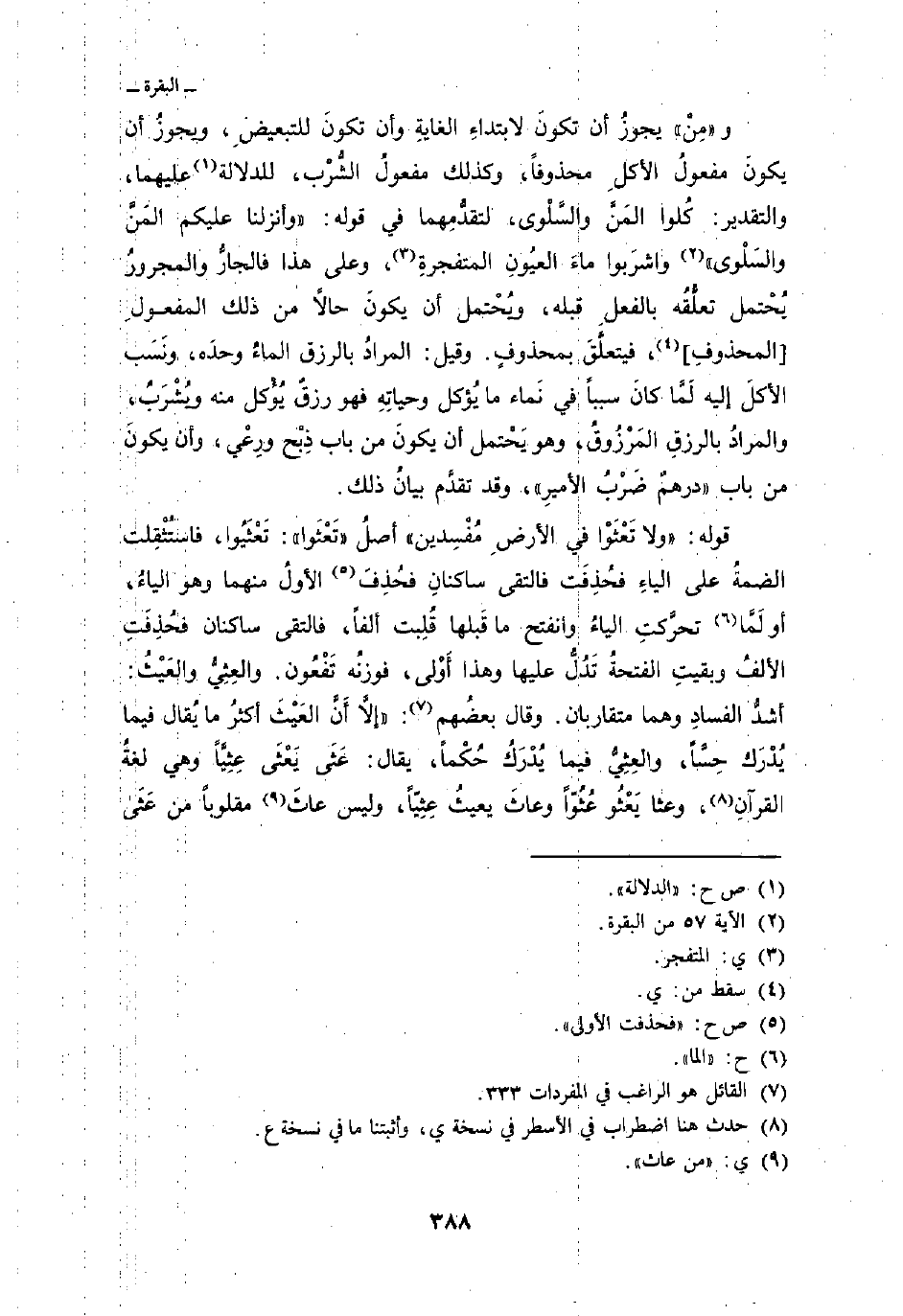 قوله: {وَلاَ تَعْثَوْاْ فِي الأرض مُفْسِدِينَ} أصلُ» تَعْثَوا «: تَعْثَيُوا، فاستُثْقِلت الضمةُ على الياءِ فحُذِفَت فالتقى ساكنانِ فحُذِفَ الأولُ منهما وهو الياءُ، أو لَمَّا تحرَّكتِ الياءُ وانفتح ما قبلَها فُلِبَت ألفاً، فالتقى ساكنان فحُذِفَتِ الألفُ وبقيتِ الفتحةُ تَدُلُّ عليها وهذا أَوْلى، فوزنُه تَفْعُون.