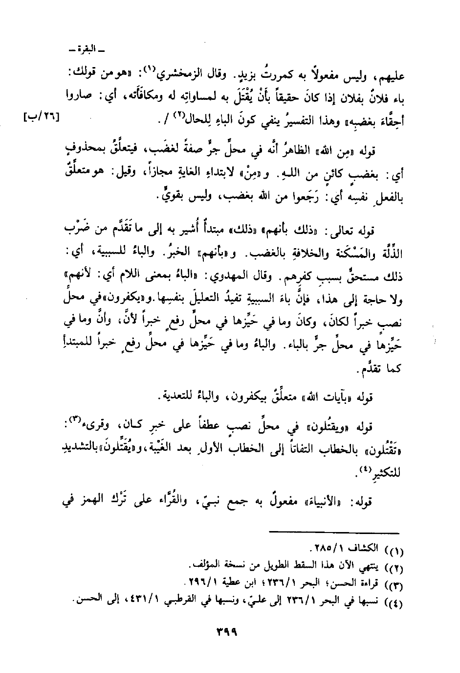 قوله تعالى: {ذَلِكَ بِأَنَّهُمْ} » ذلك «مبتدأٌ أُشير به إلى ما تَقَدَّم من ضَرْب الذِّلَّة والمَسْكَنة والخلافةِ بالغضب. و» بأنهم «الخبرُ. والباءُ للسببية، أي: ذلك مستحقٌّ بسببِ كفرِهم. وقال المهدوي:» الباءُ بمعنى اللام أي: لأنهم «ولا حاجة إلى هذا، فإنَّ باءَ السببيةِ تفيدُ التعليلَ بنفسِها. و» يكفرون «في محلِّ نصبٍ خبراً لكانَ، وكانَ وما في حَيِّزها في محلِّ رفعٍ خبراً لأنَّ، وأنَّ وما في حَيِّزها في محلِّ جرٍّ بالباء. والباءُ وما في حَيِّزها في محلِّ رفعٍ خبراً للمبتدأِ كما تقدَّم.
