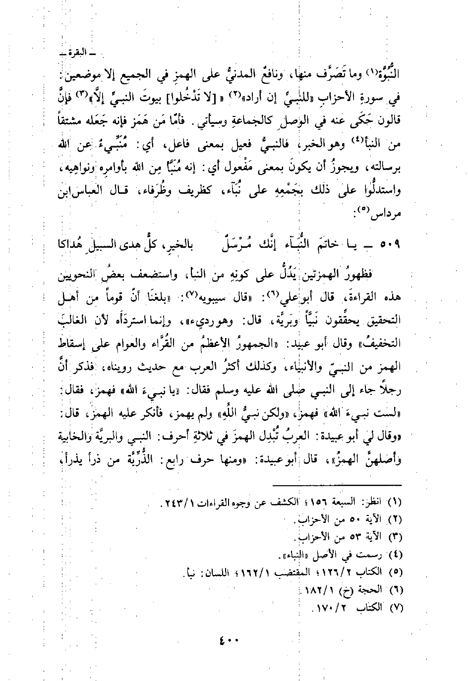 النُّبُوَّة وما تَصَرَّف منها، ونافعٌ المدنيُّ على الهمزِ في الجميع إلا موضعين: في سورةِ الأحزابِ «للنبيِّ إن أراد» « [لا تَدْخُلوا] بيوتَ النبيِّ إلاَّ» فإنَّ قالون حَكَى عنه في الوصلِ كالجماعةِ وسيأتي. فأمّا مَن هَمَز فإنه جَعَله مشتقاً من النبأ وهو الخبر، فالنبيُّ فعيل بمعنى فاعل، أي: مُنَبِّئٌ عن الله برسالته، ويجوزُ أن يكونَ بمعنى مَفْعول أي: إنه مُنَبَّأ مِن الله بأوامِره ونواهِيه، واستدلُّوا على ذلك بجَمْعِهِ على نُبَآء، كظريف وظُرَفاء، قال العباس ابن مرداس: