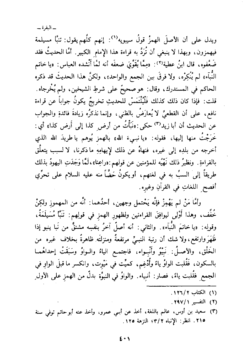 ويدل على أن الأصلَ الهمزُ قولُ سيبويه: إنهم كلَّهم يقول: تنبَّأ مسيلمة فيهمزون، وبهذا لا ينبغي أن تُرَدَّ به قراءة هذا الإِمامِ الكبير. أمَّا الحديثُ فقد ضَعَّفوه، قال ابنُ عطية: «مِمَّا يُقَوِّيَ ضعفَه أنه لمَّا أَنْشده العباس:» يا خاتم النُّبآء «لم يُنْكِرهْ، ولا فرقَ بين الجمع والواحد» ، ولكنَّ هذا الحديثَ قد ذكره الحاكم في المستدرك، وقال: هو صحيحٌ على شرطِ الشيخين، ولم يُخْرجاه. قلت: فإذا كان ذلك كذلك فَلْيُلْتَمَسْ للحديثِ تخريجٌ يكونُ جواباً عن قراءة نافع، على أن القطعيَّ لا يُعارَضُ بالظني، وإنما نذكرُه زيادةَ فائدةِ والجواب عن الحديث أن أبا زيد حكى: «نَبَأْتُ من أرضِ كذا إلى أَرض كذا» أي: خَرَجْتُ منها إليها، فقوله: «يا نبيءَ الله» بالهمز يُوهم يا طريدَ الله الذي أخرجه من بلدِه إلى غيره، فنهاهُ عن ذلك لإِيهامِهِ ما ذكرنا، لا لسبب يتعلَّق بالقراءةِ.