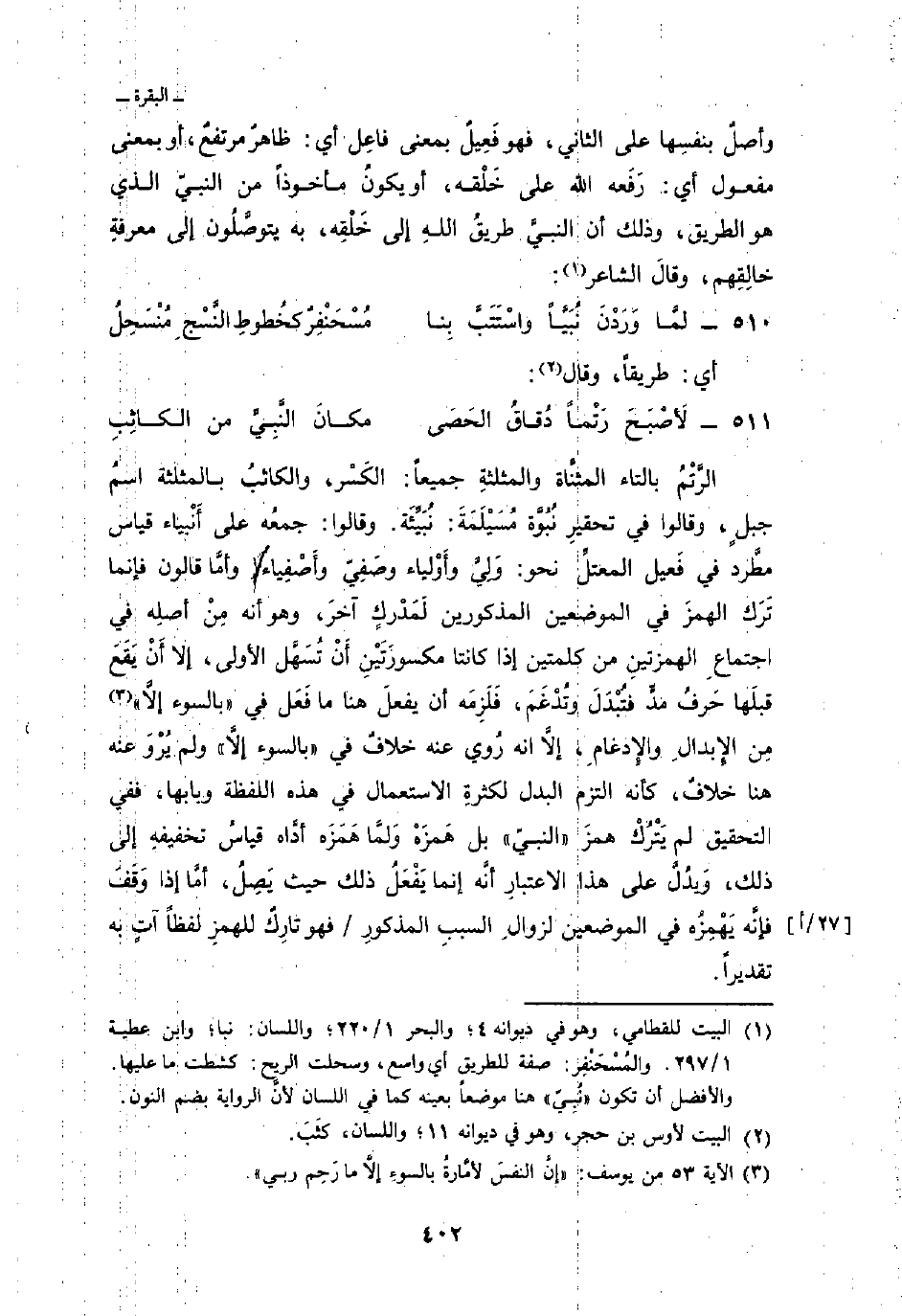 الرَّتْمُ بالتاء المثنَّاة والمثلثةِ جميعاً: الكَسْر، والكاثبُ بالمثلثة اسمُ جبلٍ، وقالوا في تحقير نُبُوَّة مُسَيْلَمَةَ: نُبَيِّئَة. وقالوا: جمعُه على أَنْبياء قياس مطَّرد في فَعيل المعتلِّ نحو: وَلِيَّ وأَوْلياء وصَفِيّ وأَصْفِياء. وأمَّا قالون فإنما تَرَك الهمزَ في الموضعين المذكورين لَمَدْركٍ آخرَ، وهو أنه مِنْ أصلِه في اجتماعِ الهمزتين من كلمتين إذا كانتا مكسورَتَيْنِ أَنْ تُسَهَّل الأولى، إلا أنْ يَقَعَ قبلَها حَرفُ مدٍّ فتُبْدَلَ وتُدْغَمَ، فَلَزِمَه أن يفعل هنا ما فَعَل في «بالسوء إلاَّ» مِن الإِبدالِ والإِدغامِ، إلاَّ أنه رُوي عنه خلافٌ في «بالسوء إلاَّ» ولم يُرْوَ عنه هنا خلافٌ، كأنه التزم البدل لكثرةِ الاستعمال في هذه اللفظة وبابها، ففي التحقيق لم يَتْرُكْ همزَ «النبيّ» بل هَمزَهْ وَلمَّا هَمَزَه أدَّاه قياسُ تخفيفِه إلى ذلك، وَيدُلَّ على هذا الاعتبارِ أنَّه إنما يَفْعَلُ ذلك حيث يَصِلُ، أمَّا إذا وَقَفَ فإنَّه يَهْمِزُه في الموضعين لزوالِ السببِ المذكورِ/ فهو تارِكٌ للهمزِ لفظاً آتٍ به تقديراً.