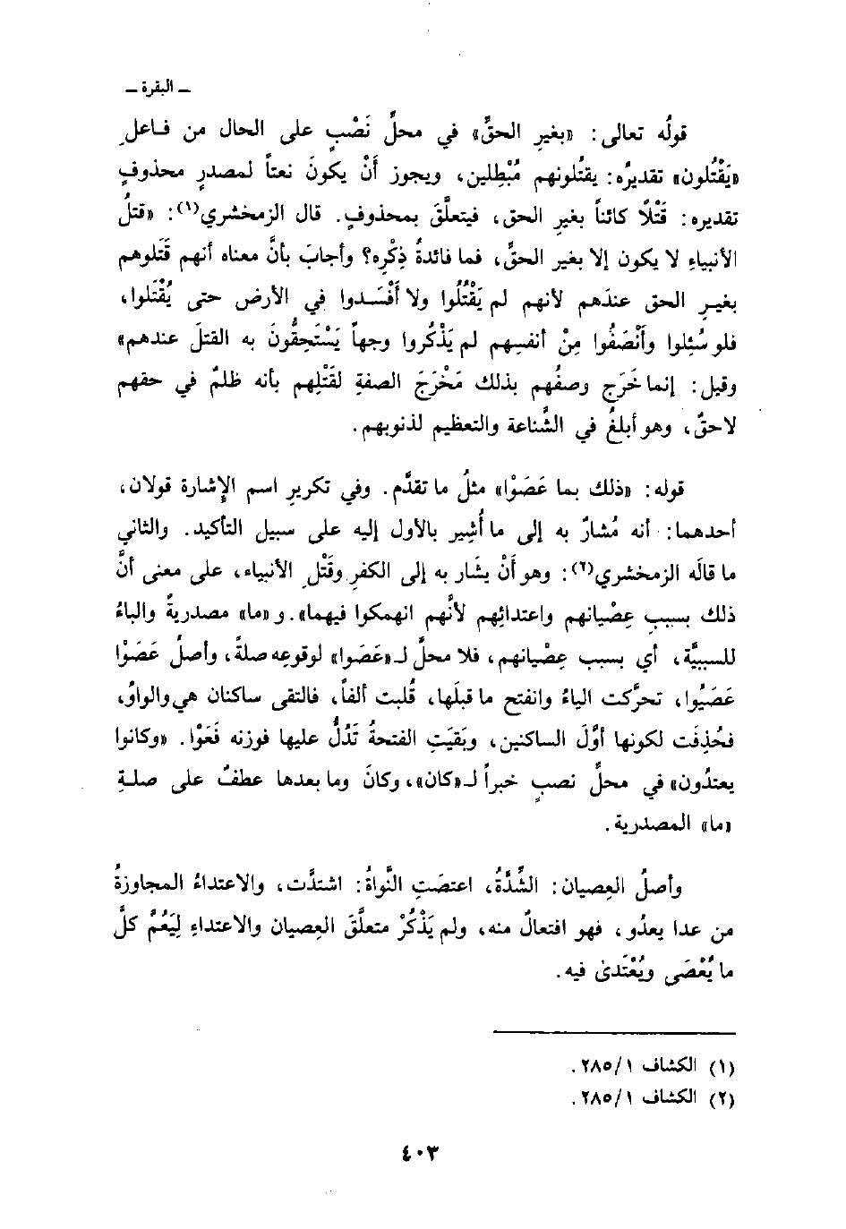 قوله: {ذلك بِمَا عَصَواْ} مثلُ ما تقدَّم. وفي تكريرِ اسم الإِشارة قولان، أحدهما: أنه مُشارٌ به إلى ما أَشِير بالأول إليه على سبيل التأكيد. والثاني ما قالَه الزمخشري: وهو أَنْ يشَار به إلى الكفرِ وقَتْلِ الأنبياء، على معنى أنَّ ذلك بسببِ عِصْيانهم واعتدائِهم لأنَّهم انهمكوا فيهما «. و» ما «مصدريةٌ والباءُ للسببيَّة، أي بسبب عِصْيانهم، فلا محلَّ ل» عَصَوا «لوقوعِه صلةً، وأصلُ عَصَوْا عَصَيُوا، تحرَّكت الياءُ وانفتح ما قبلَها، قُلبت ألفاً، فالتقى ساكنان هي والواوُ، فحُذِفَت لكونها أوَّلَ الساكنين، وبَقيَتِ الفتحةُ تَدُلُّ عليها فوزنه فَعَوْا.» وكانوا يعتدُون «في محلِّ نصبٍ خبراً ل» كان «، وكانَ وما بعدها عطفٌ على صلةِ» ما «المصدرية.