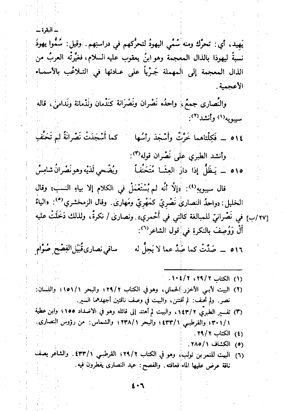قال سيبويه: «إلاَّ أنَّه لم يُسْتَعْمَلْ في الكلام إلا بياءِ النسب» وقال الخليل: «واحدُ النصارى نَصْرِيّ كمَهْرِيّ ومهارى. وقال الزمخشري:: الياءُ في نَصْرانيّ للمبالغة كالتي في أَحْمَري» . ونصارى/ نكرةٌ، ولذلك دَخَلَتْ عليه أَلْ وَوُصِفَ بالنكرةِ في قول الشاعر: