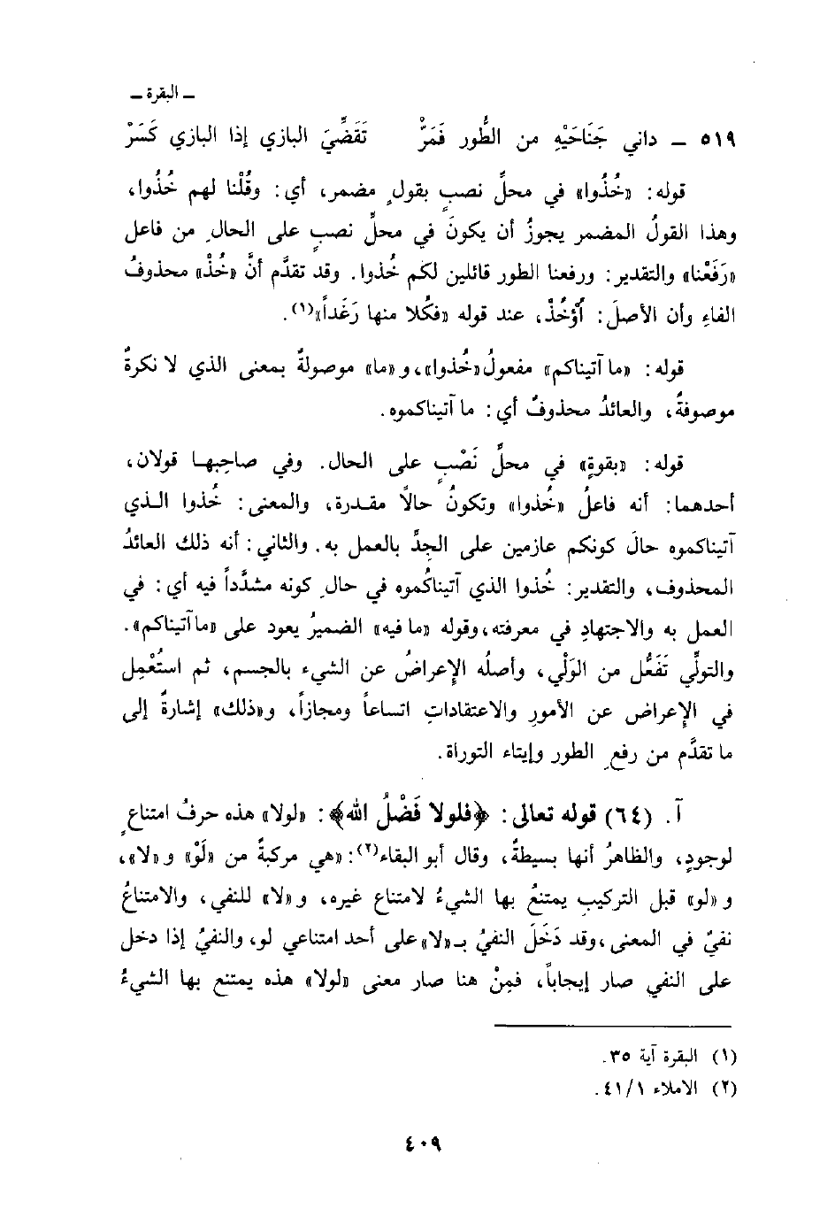 قوله: «بقوةٍ» في محلِّ نَصْبٍ على الحال. وفي صاحِبها قولان، أحدهما: أنه فاعلُ «خُذوا» وتكونُ حالاً مقدرة، والمعنى: خُذوا الذي آتيناكموه حالَ كونكم عازمين على الجِدِّ بالعمل به. والثاني: أنه ذلك العائدُ المحذوف، والتقدير: خُذوا الذي آتيناكُموه في حالِ كونه مشدَّداً فيه أي: في العمل به والاجتهادِ في معرفته، وقوله «ما فيه» الضميرُ يعود على «ما آتيناكم» . والتولِّي تَفَعُّل من الوَلْي، وأصلُه الإِعراضُ عن الشيء بالجسم، ثم استُعْمِل في الإِعراض عن الأمورِ والاعتقاداتِ اتساعاً ومجازاً، و «ذلك» إشارةٌ إلى ما تقدَّم من رفعِ الطور وإيتاء التوراة.
