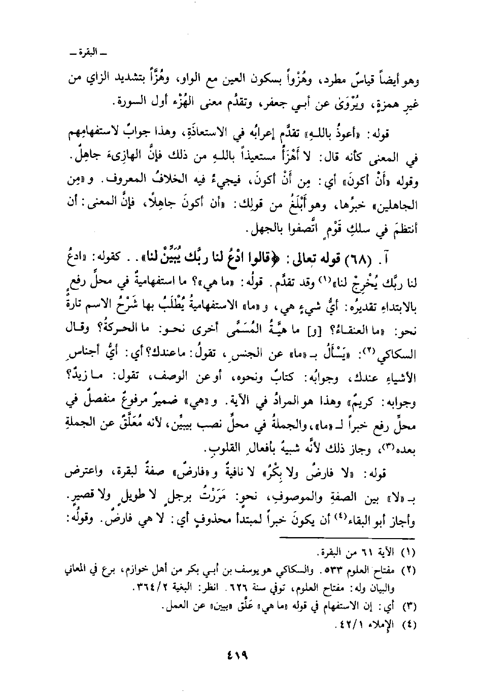 قوله: {لاَّ فَارِضٌ وَلاَ بِكْرٌ} لا نافيةٌ، و» فارضٌ «صفةٌ لبقرة، واعترض ب» لا «بين الصفةِ والموصوفِ، نحوٍ: مَرَرْتُ برجلٍ لا طويلٍ ولا قصيرٍ. وأجاز أبو البقاء أن يكونَ خبراً لمبتدأ محذوفٍ أي: لا هي فارضٌ. وقولُه: {