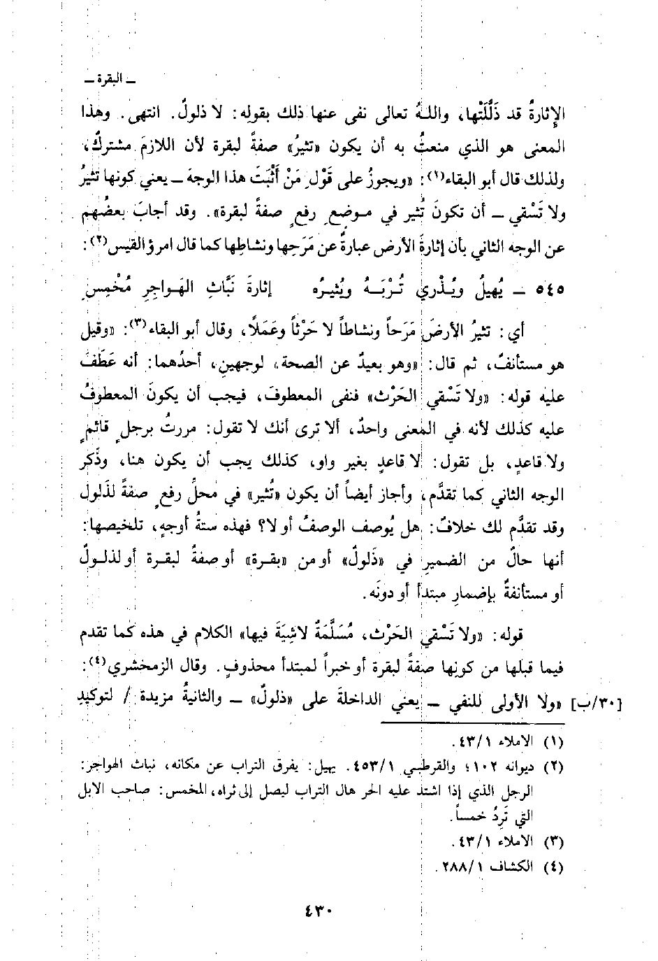 الإِثارةُ قد ذَلَّلَتْها، واللهُ تعالى نفى عنها ذلك بقولِه: لا ذلولٌ. انتهى. وهذا المعنى هو الذي منعتُ به أن يكون» تثيرُ «صفةً لبقرة لأن اللازمَ مشتركٌ، ولذلك قال أبو البقاء:» ويجوزُ على قَوْلِ مَنْ أَثْبَتَ هذا الوجهَ يعني كونها تثيرُ ولا تَسْقي أن تكونَ تُثير في موضعِ رفعٍ صفةً لبقرة «. وقد أجابَ بعضُهم عن الوجه الثاني بأن إثارةَ الأرض عبارةٌ عن مَرَحِها ونشاطِها كما قال امرؤ القيس: