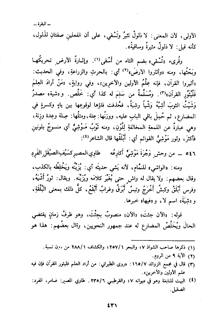 وقُرئ» تُسْقي «بضم التاء من أَسْقى. وإثارةُ الأرضِ تحريكُها وبَحْثُها، ومنه {وَأَثَارُواْ الأرض} [الروم: 9] أي: بالحرثِ والزراعةِ، وفي الحديث:» أثيروا القرآن، فإنه عِلْمُ الأولين والآخرِين «، وفي روايةٍ،» مَنْ أرادَ العِلمَ فَلْيُثَوِّرِ القرآن «ومُسَلَّمةٌ من سَلِمَ له كذا أي: خَلُص. و» شية «مصدرٌ وَشَيْتُ الثوبَ أَشِيْهُ وَشْياً وشِيَةً، فحُذفت فاؤها لوقوعِها بين ياءٍ وكسرةٍ في المضارع، ثم حُمِلَ باقي البابِ عليه، ووزنُها: عِلة، ومثلُها: صِلة وعِدة وزِنة، وهي عبارةٌ عن اللمعةِ المخالفةِ للَّوْنِ، ومنه ثَوْبٌ مَوْشِيٌّ أي منسوجٌ بلونينِ فأكثرَ، وثور مَوْشِيُّ القوائم أي: أَبْلَقُها قال الشاعر: