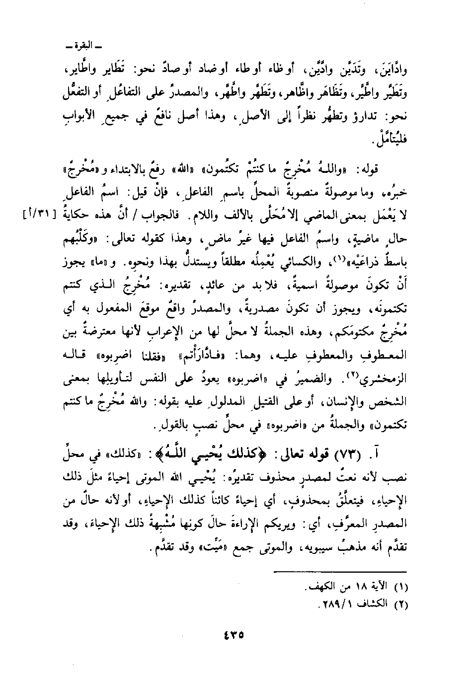 قوله: {والله مُخْرِجٌ مَّا كُنْتُمْ تَكْتُمُونَ} » الله «رفعٌ بالابتداء و» مُخْرجٌ «خبرُه، وما موصولةٌ منصوبةٌ المحلِّ باسمِ الفاعلِ، فإنْ قيل: اسمُ الفاعلِ لا يَعْمَل بمعنى الماضي إلا مُحَلَّى بالألف واللام. فالجواب/ أنَّ هذه حكايةُ حالٍ ماضيةٍ، واسمُ الفاعل فيها غير ماضٍ، وهذا كقوله تعالى: {وَكَلْبُهُمْ بَاسِطٌ ذِرَاعَيْهِ} [الكهف: 18] ، والكسائي يُعْمِلُه مطلقاً ويستدلُّ بهذا ونحوهِ. و» ما «يجوز أَنْ تكونَ موصولةً اسميةً، فلا بد من عائدٍ، تقديره: مُخْرِجُ الذي كنتم تكتمونَه، ويجوز أن تكونَ مصدريةً، والمصدرُ واقعٌ موقعَ المفعول به أي مُخْرِجٌ مكتومَكم، وهذه الجملةُ لا محلَّ لها من الإِعرابِ لأنها معترضةٌ بين المعطوفِ والمعطوفِ عليه، وهما:» فادَّارَأْتم «» فقلنا اضرِبوه «قاله الزمخشري. والضميرُ في» اضربوه «يعودُ على النفس لتأويلِها بمعنى الشخص والإِنسان، أو على القتيلِ المدلولِ عليه بقوله: والله مُخْرِجٌ ما كنتم تكتمون» . والجملةُ من «اضربوه» محلِّ نصبٍ بالقولِ.