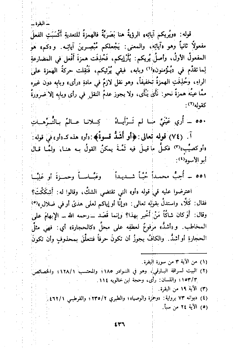 اعترضوا عليه في قوله «أو» التي تقتضي الشكَّ، وقالوا له: أَشَكَكْتَ؟ فقال: كَلاَّ، واستدلَّ بقولِه تعالى: {وَإِنَّآ أَوْ إِيَّاكُمْ لعلى هُدًى أَوْ فِي ضَلاَلٍ} [سبأ: 24] وقال: أَوَ كان شاكَّاً مَنْ أَخْبر بهذا؟ وإنما قَصَد رحمه الله الإِبهامَ على المخاطب. و «أشدُّ» مرفوعٌ لعطفِه على محلِّ «كالحجارة» أي: فهي مثلُ الحجارةِ أو أشدُّ. والكافُ يجوزُ أن تكونَ حرفاً فتتعلَّقَ بمحذوفٍ وأن تكونَ