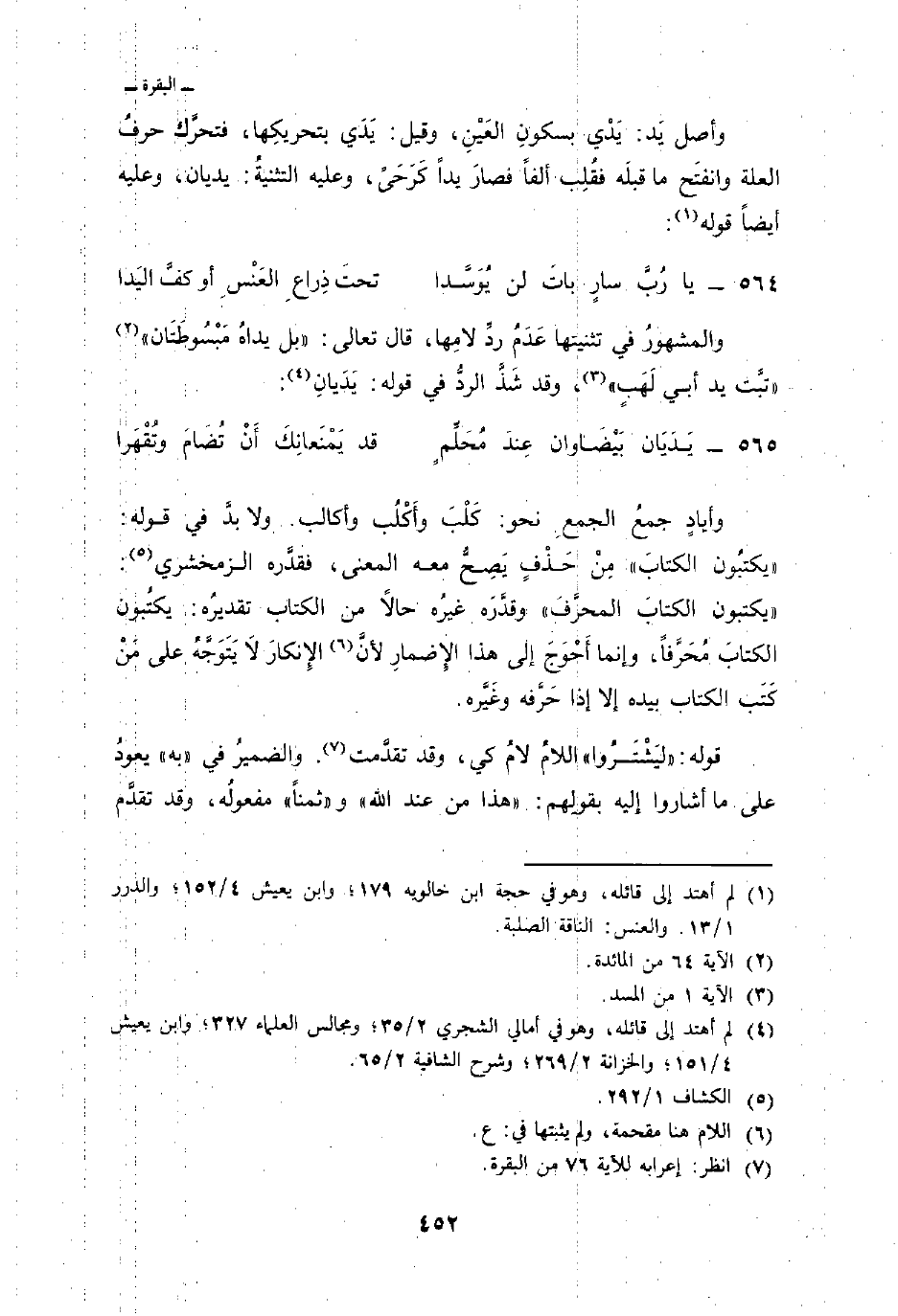 وأيادٍ جمعُ الجمعِ نحو: كَلْبَ وأَكْلُب وأكالب. ولا بدَّ في قوله: {يَكْتُبُونَ الكتاب} مِنْ حَذْفٍ يَصِحُّ معه المعنى، فقدَّره الزمخشري:» يكتبونَ الكتابَ المحرَّفَ «وقدَّرَه غيرُه حالاً من الكتاب تقديرُه: يكتُبون الكتابَ مُحَرَّفاً، وإنما أَحْوَجَ إلى هذا الإِضمارِ لأنَّ الإِنكارَ لاَ يَتَوَجَّهُ على مَنْ كَتَب الكتاب بيده إلا إذا حَرَّفه وغَيَّره.