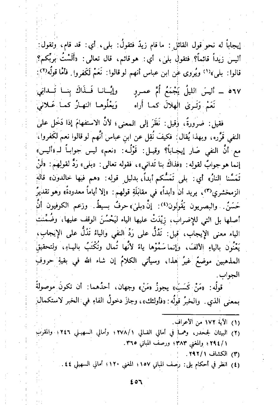 فقيل: ضرورةٌ، وقيل: نَظَرَ إلى المعنى؛ لأنَّ الاستفهامَ إذا دَخَل على النفي قَرَّره، وبهذا يُقال: فكيفَ نُقِل عن ابنِ عباس أنَّهم لو قالوا نعم لكَفروا، مع أنَّ النفي صَار إيجاباً؟ وقيل: قَوْلُه: «نعم» ليس جواباً ل «أليس» إنما هو جوابٌ لقولِه: «فذاكَ بنا تَداني» فقوله تعالى: «بلى» رَدٌّ لقولِهم: {لَن تَمَسَّنَا النار} أي: بلى تَمَسُّكم أبداً، بدليلِ قولِه: {هُمْ فِيهَا خَالِدُونَ} قاله الزمخشري، يريد أن «أبداً» في مقابَلَةِ قولهم: {إِلاَّ أَيَّاماً مَّعْدُودَةً} وهو تقديرٌ حَسَنٌ. والبصريون يَقُولون: إنَّ «بلى» حرفٌ بسيطٌ. وزعم الكوفيون أنَّ أصلها بل التي للإِضراب، زِيْدَتْ عليها الياء ليَحْسُنَ الوقف عليها، وضُمِّنت الياء معنى الإِيجاب، قيل: تَدُلُّ على رَدِّ النفي والياءُ تَدُلُّ على الإِيجابِ، يَعْنُون بالياءِ الألفَ، وإنما سَمَّوْها ياءً لأنَّها تُمال وتُكْتَبُ بالياءِ، ولتحقيقِ المذهبين موضعٌ غيرُ هذا، وسيأتي الكلامُ إن شاء الله في بقيةِ حروفِ الجواب.