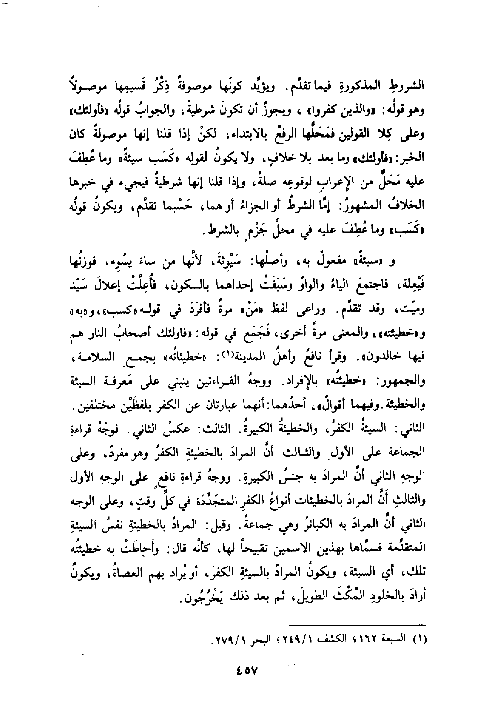 الشروطِ المذكورةِ فيما تقدَّم. ويؤيِّد كونَها موصوفةً ذِكْرُ قَسيمِها موصولاً وهو قولُه: {والذين كَفَرواْ} ، ويجوزُ أن تكونَ شرطيةً، والجوابُ قولُه «فأولئك» وعلى كِلا القولين فمَحَلُّها الرفعُ بالابتداء، لكنْ إذا قلنا إنها موصولةٌ كان الخبر: «فأولئك» وما بعد بلا خلافٍ، ولا يكونُ لقولِه {كَسَبَ سَيِّئَةً} وما عُطِفَ عليه مَحَلٌّ من الإِعرابِ لوقوعِه صلةً، وإذا قلنا إنها شرطيةٌ فيجيء في خبرها الخلافُ المشهورُ: إمَّا الشرطُ أو الجزاءُ أو هما، حَسْبما تقدَّم، ويكونُ قولُه «كَسَب» وما عُطِفَ عليه في محلِّ جَزْمٍ بالشرط.