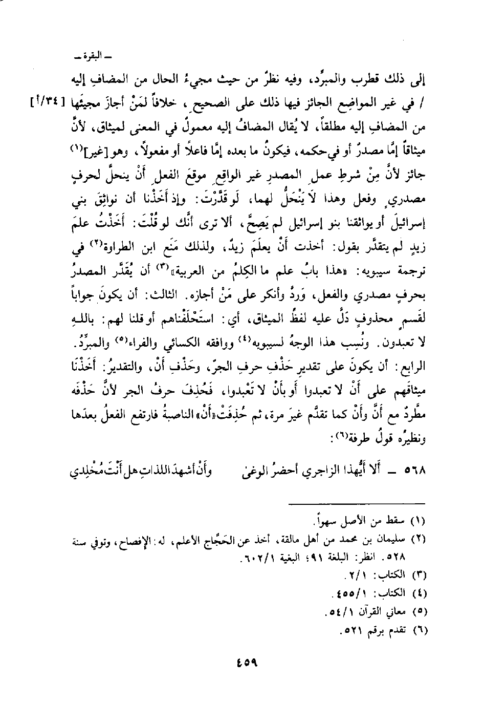 إلى ذلك قطرب والمبرِّد، وفيه نظرٌ من حيث مجيءُ الحال من المضافِ إليه/ في غير المواضِع الجائز فيها ذلك على الصحيحِ، خلافاً لمَنْ أجازَ مجيئَها من المضافِ إليه مطلقاً، لا يُقال المضافُ إليه معمولٌ في المعنى لميثاق، لأنَّ ميثاقاً إمَّا مصدرٌ أو في حكمه، فيكونُ ما بعده إمَّا فاعلاً أو مفعولاً، وهو [غير] جائز لأنَّ مِنْ شرطِ عملِ المصدرِ غير الواقِعِ موقعَ الفعلِ أَنْ ينحلَّ لحرفٍ مصدريٍ وفعل هذا لاَ يَنْحَلُّ لهما، لَو قَدَّرْتَ: وإذ أَخَذْنا أن نواثِقَ بني إسرائيلَ أو يواثقنا بنو إسرائيل لم يَصِحَّ، ألا ترى أنَّك لو قُلْتَ: أَخَذْتُ علمَ زيدٍ لم يتقدَّر بقول: أخذت أَنْ يعلَمَ زيدٌ، ولذلك مَنَع ابن الطراوة في ترجمة سيبويه: «هذا بابُ علم ما الكِلمُ من العربية» أن يُقَدَّر المصدرُ بحرفٍ مصدري والفعل، وَردَّ وأنكر على مَنْ أجازه. الثالث: أن يكنَ جواباً لقسمٍ محذوفٍ دَلَّ عليه لفظُ الميثاق، أي: استَحْلَفْناهم أو قلنا لهم: باللهِ لا تعبدون. ونُسِب هذا الوجهُ لسيبويه ووافقه الكسائي والفراء والمبرِّدُ. الرابع: أن يكونَ على تقديرِ حَذْفِ حرفِ الجرّ، وحَذْفِ أَنْ، والتقديرُ: أَخَذْنَا ميثاقَهم على أَنْ لا تعبدوا أَو بأَنْ لا تَعْبدوا، فَحُذِفَ حرفُ الجر لأنَّ حَذْفَه مطَّردٌ مع أَنَّ وأَنْ كما تقدَّم غيرَ مرة، ثم حُذِفَتْ «أَنْ» الناصبةُ فارتفع الفعلُ بعدَها ونظيرُه قولُ طرفة: