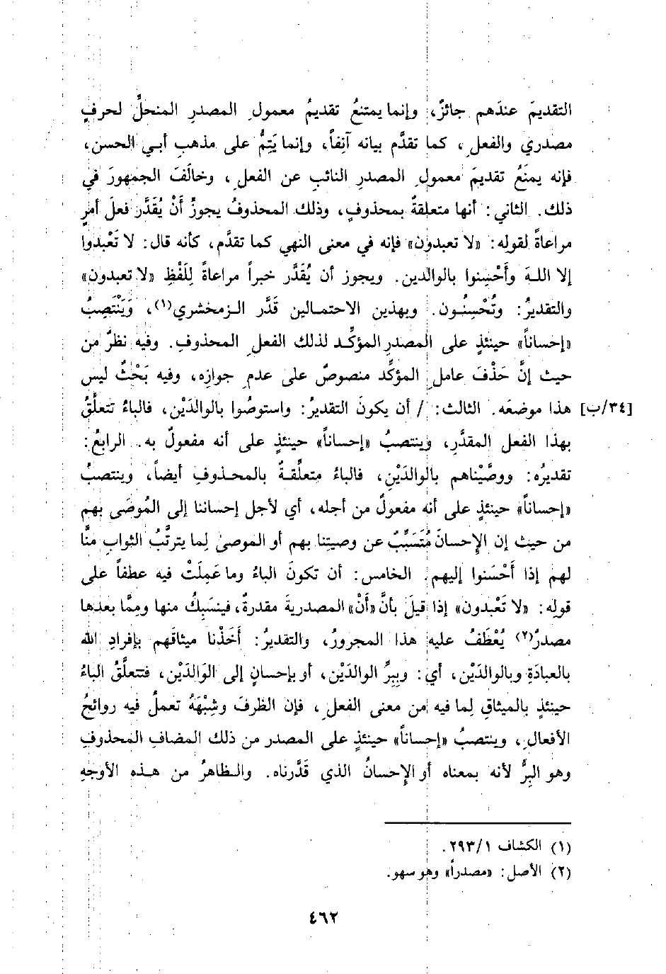 التقديمَ عندَهم جائزٌ، وإنما يمتنعُ تقديمُ معمولِ المصدرِ المنحلِّ لحرفٍ مصدري والفعلِ، كما تقدَّم بيانه آنِفاً، وإنما يَتِمُّ على مذهبِ أبي الحسن، فإنه يمنَعُ تقديمَ معمولِ المصدرِ النائبِ عن الفعلِ، وخالَفَ الجمهورَ في ذلك. الثاني: أنها متعلقةٌ بمحذوفٍ، وذلك المحذوفُ يجوزُ أَنْ يُقَدَّر فعلَ أمرٍ مراعاةً لقولِه: {لاَ تَعْبُدُونَ} فإنه في معنى النهي كما تقدَّم، كأنه قال: لا تَعْبدوا إلا اللهَ وأَحْسِنوا بالوالدين. ويجوز أن يُقَدَّر خبراً مراعاةً لِلَفْظِ «لا تعبدون» والتقديرُ: وتُحْسِنُون. وبهذين الاحتمالين قَدَّر الزمخشري، وَيَنْتَصِبُ «إحساناً» حينئذٍ على المصدرِ المؤكِّد لذلك الفعلِ المحذوفِ. وفيه نظرٌ من حيث إنَّ حَذْفَ عاملِ المؤكِّد منصوصٌ على عدمِ جوازِه، وفيه بَحْثٌ ليس هذا موضعَه. الثالث: / أن يكونَ التقديرُ: واستوصُوا بالوالدَيْن فالباءُ تتعلَّقُ بهذا الفعل المقدَّرِ، وينتصبُ «إحساناً» حينئذٍ على أنه مفعولٌ به. الرابعُ: تقديرُه: ووصَّيْناهم بالوالدَيْنِ، فالباءُ متعلِّقةٌ بالمحذوفِ أيضاً، وينتصبُ «إحساناً» حينئذٍ على أنه مفعولٌ من أجلهِ، أي لأجل إحساننا إلى المُوصَى بهم من حيث إن الإِحسانَ مُتَسَبِّبٌ عن وصيتِنا بهم أو الموصى لِما يترتَّبُ الثوابِ منَّا لهم إذا أَحْسَنوا إليهم. الخامس: أن تكونَ الباءُ وما عَمِلَتْ فيه عطفاً على قولِه: {لاَ تَعْبُدُونَ} إذا قيلَ بأنَّ «أَنْ» المصدريةَ مقدرةٌ، فينسِبُكَ منها ومِمَّا بعدها مصدرٌ يُعْطَفُ عليه هذا المجرورُ، والتقديرُ: أََخَذْنا ميثاقَهم بإفرادِ الله بالعبادَةِ وبالوالدَيْن، أي: وبِبِرِّ الوالدَيْن، أو بإحسانٍ إلى الوَالدَيْن، فتتعلَّقُ الباءُ حينئذٍ بالميثاقِ لِما فيه من معنى الفعلِ، فإن الظرفَ وشِبْهَهُ تعملُ فيه روائحُ الأفعالِ، وينتصبُ «إحساناً» حينئذٍ على المصدر من ذلك المضافِ المحذوفِ وهو البِرُّ لأنه بمعناه أو الإِحسانُ الذي قَدَّرناه. والظاهرُ من هذه الأوجهِ