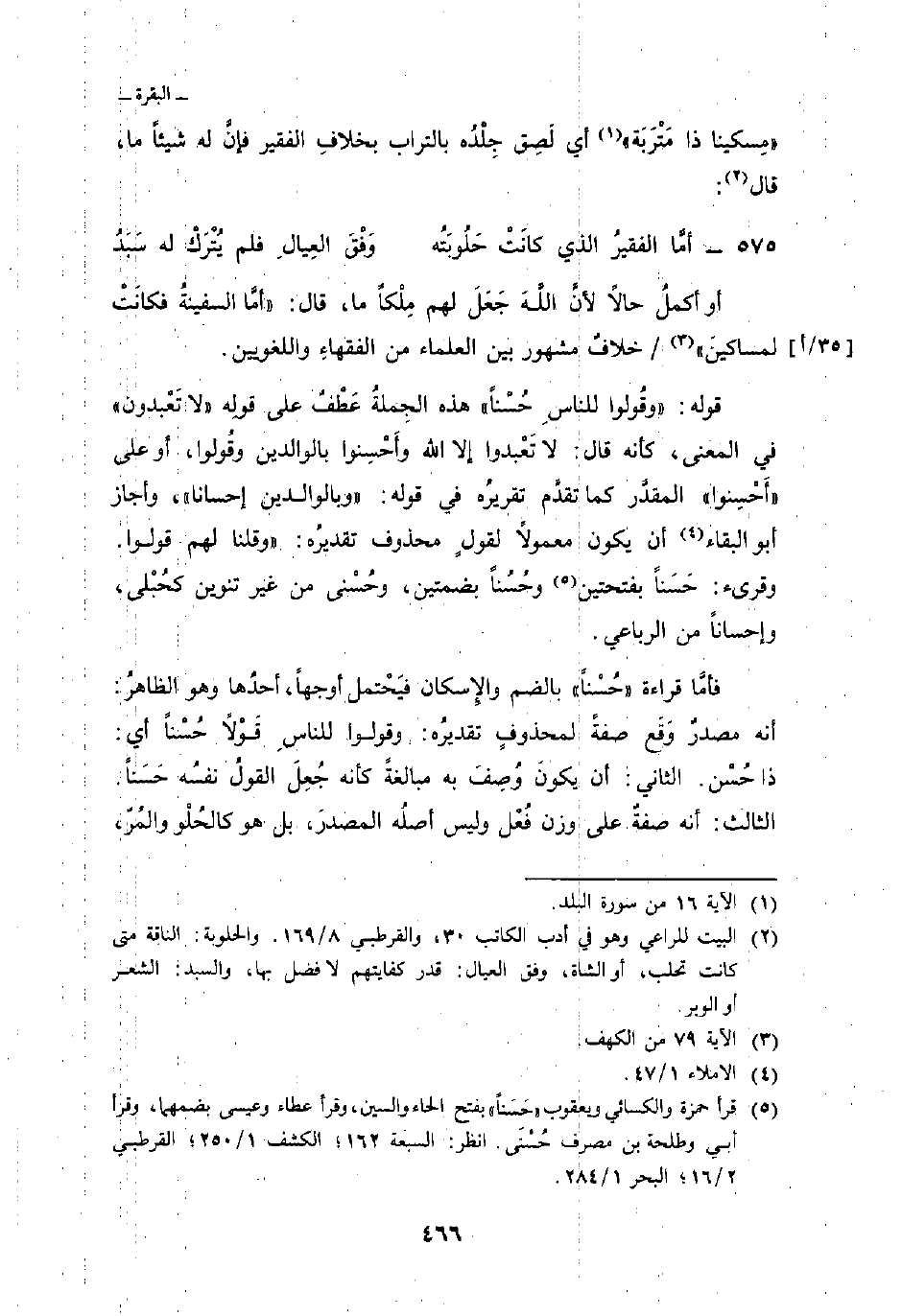 فامَّا قراءة» حُسْناً «بالضم والإِسكان فيَحْتمل أوجهاً، أحدُها وهو الظاهرُ: أنه مصدرٌ وَقَع صفةً لمحذوفٍ تقديرُه: وقولوا للناسِ قَوْلاً حُسْناً أي: ذا حُسْن. الثاني: أن يكونَ وُصِفَ به مبالغةً كأنه جُعِلَ القولُ نفسُه حَسَناً. الثالث: أنه صفةٌ على وزن فُعْل وليس أصلُه المصدرَ، بل هو كالحُلْو والمُرّ،