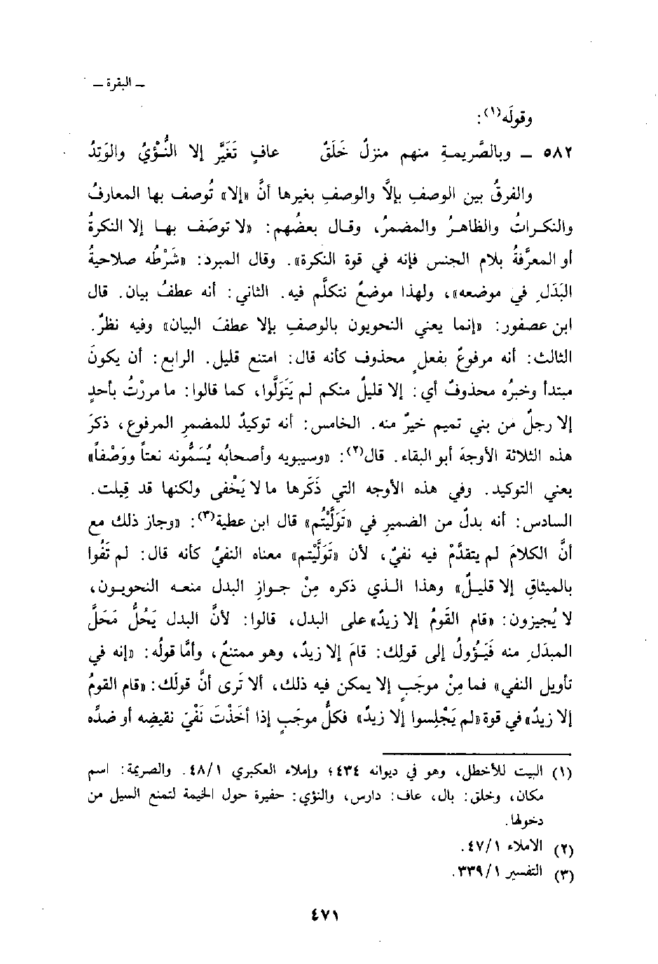 والفرقُ بين الوصفِ بإلاَّ والوصفِ بغيرها أنَّ» إلا «تُوصف بها المعارفُ والنكراتُ والظاهرُ والمضمرُ، وقال بعضُهم:» لا توصَف بها إلا النكرةُ أو المعرَّفةُ بلام الجنس فإنه في قوة النكرة «. وقال المبرد:» شَرْطُه صلاحيةُ البَدَلِ في موضعه «، ولهذا موضعٌ نتكلَّم فيه. الثاني: أنه عطفُ بيان. قال ابن عصفور:» إنما يعني النحويون بالوصفِ بإلا عطفَ البيان «وفيه نظرٌ. الثالث: أنه مرفوعٌ بفعلٍ محذوف كأنه قال: امتنع قليل. الرابع: أن يكونَ مبتدأ وخبرُه محذوفٌ أي: إلا قليلٌ منكم لم يَتَوَلُّوا، كما قالوا: ما مررْتُ بأحدٍ إلا رجلٌ من بني تميم خيرٌ منه. الخامس: أنه توكيدٌ للمضمرِ المرفوع، ذكرَ هذه الثلاثة الأوجهَ أبو البقاء. قال:» وسيبويه وأصحابُه يُسَمُّونه نعتاً ووَصْفاً «يعني التوكيد. وفي هذه الأوجه التي ذَكَرها ما لا يَخْفى ولكنها قد قِيلت. السادس: أنه بدلٌ من الضميرِ في» تَوَلَّيْتُم «قال ابن عطية:» وجاز ذلك مع أنَّ الكلامَ لم يتقدَّمْ فيه نفيٌ، لأن «تَوَلَّيْتم» معناه النفيُ كأنه قال: لم تَفُوا بالميثاقِ إلا قليلٌ «وهذا الذي ذكره مِنْ جوازِ البدل منعه النحويون، لا يُجيزون:» قام القَومُ إلا زيدٌ «على البدل، قالوا: لأنَّ البدل يَحُلُّ مَحَلَّ المبدَلِ منه فَيَؤُولُ إلى قولِك: قامَ إلا زيدٌ، وهو ممتنعٌ، وأمَّا قولُه: إنه في تأويل النفي» فما مِنْ موجَبٍ إلا يمكن فيه ذلك، ألا تَرى أنَّ قولَك: «قام القومُ إلا زيدٌ» في قوة «لم يَجْلِسُوا إلا زيدٌ» فكلُّ موجَبٍ إذا أخَذْتَ نَفْيَ نقيضِه أو ضدِّه