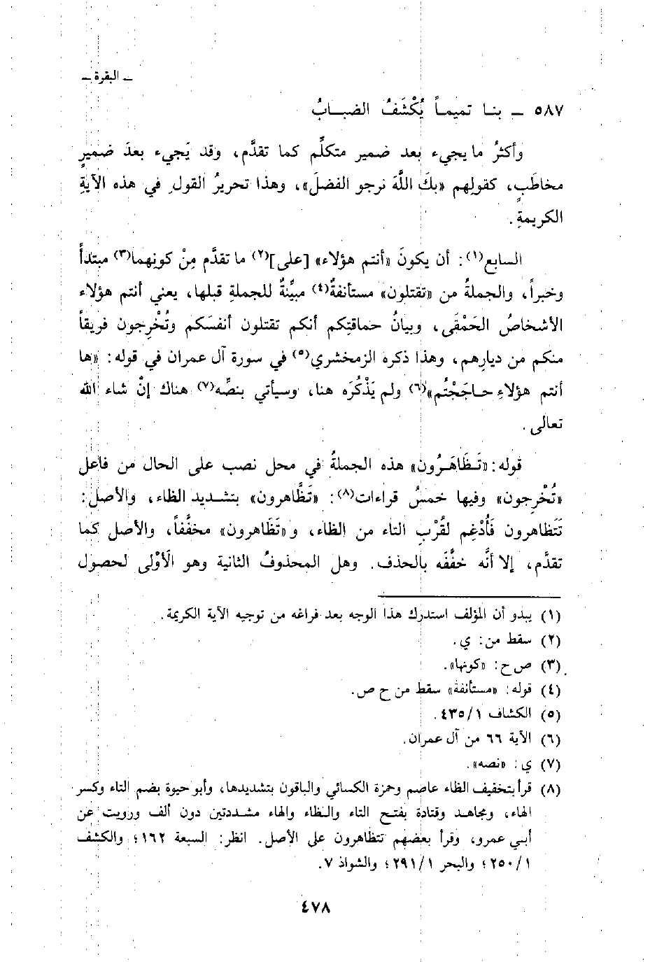 السابع: أن يكونَ {أَنْتُمْ هؤلاء} [على] ما تقدَّم مِنْ كونِهما مبتدأ وخبراً، والجملةُ من «تقتلون» مستأنفةٌ مبيِّنةٌ للجملةِ قبلها، يعني أنتم هؤلاء الأشخاصُ الحَمْقَى، وبيانُ حماقتِكم أنكم تقتلون أنفسَكم وتُخْرِجون فريقاًَ منكم من ديارِهم، وهذا ذكره الزمخشري في سورة آل عمران في قوله: {هاأنتم هؤلاء حَاجَجْتُمْ} [آل عمران: 66] ولم يَذْكُرَه هنا، وسيأتي بنصِّه هناك إنْ شاء الله تعالى.