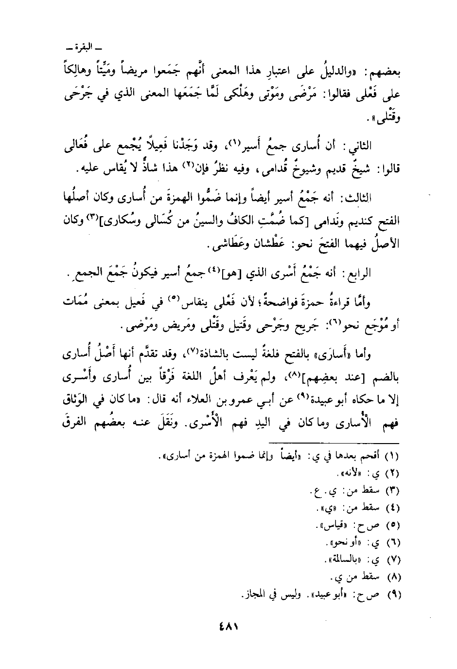 الثاني: أن أُسارى جمعُ أَسير، وقد وَجَدْنا فَعِيلاً يُجْمع على فُعَالى قالوا: شيخٌ قديم وشيوخٌ قُدامى، وفيه نظرٌ فإن هذا شاذٌّ لا يُقاس عليه.