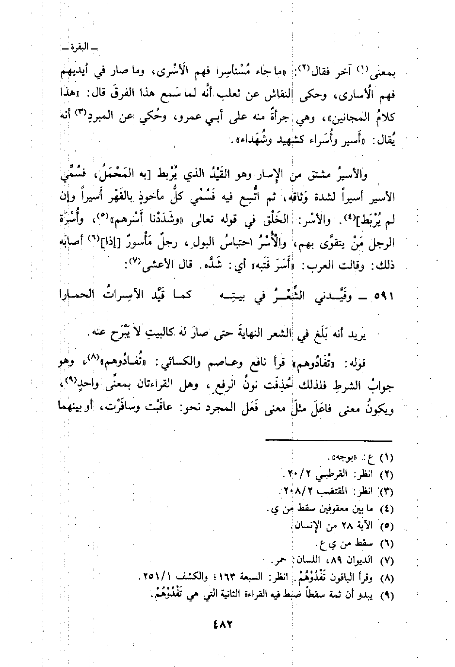 بمعنى آخر فقال:» ما جاء مُسْتأسِرا فهم الأَسْرى، وما صار في أيديهم فهم الأُسارى، وحكى النقاش عن ثعلب أنَّه لما سَمع هذا الفرقَ قال: «هذا كلامُ المجانين» ، وهي جرأةٌ منه على أبي عمرو، وحُكي عن المبردِ أنه يُقال: «أَسير وأُسَراء كشهيد وشُهَداء» .