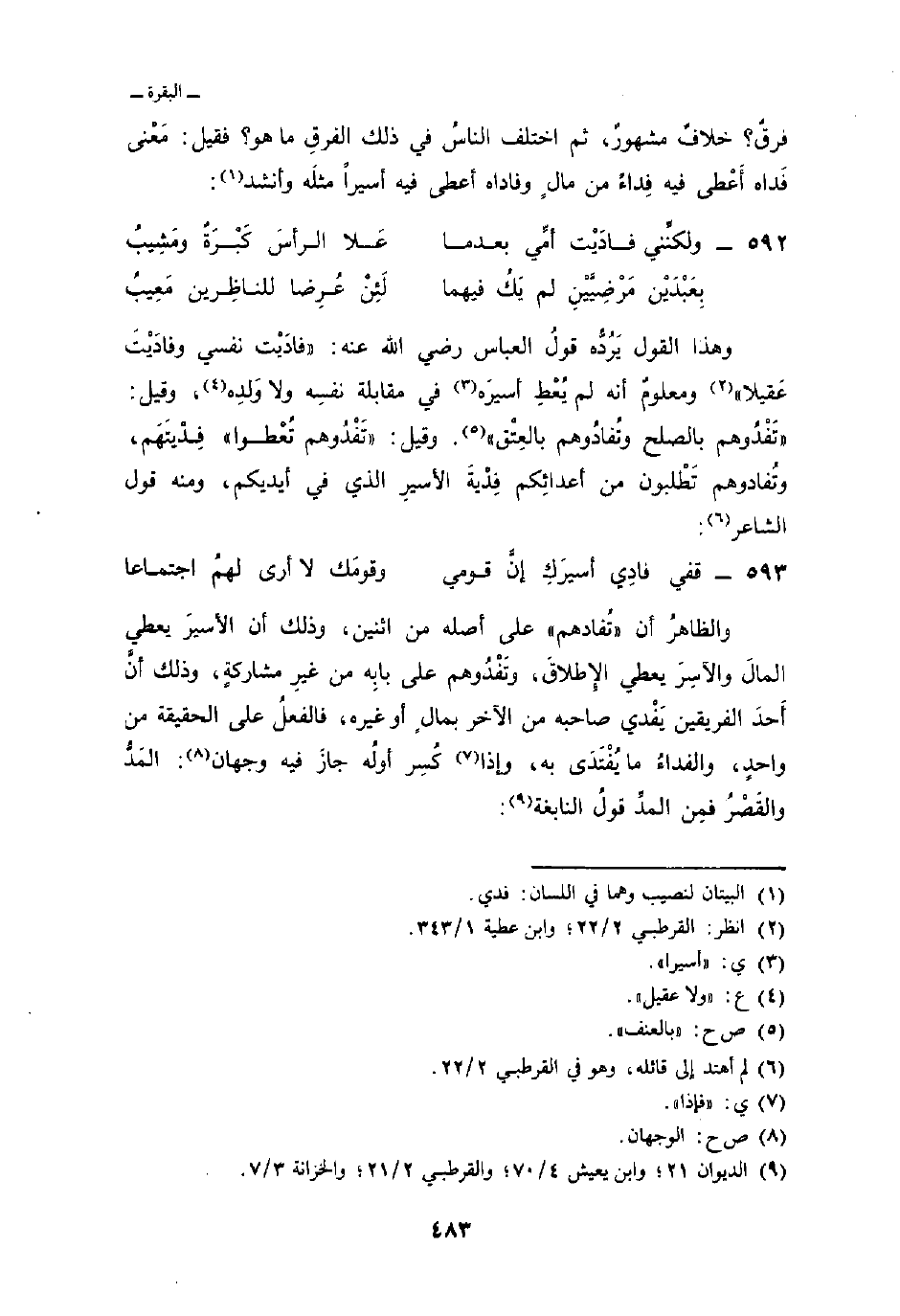 وهذا القول يَرُدُّه قولُ العباس رضي الله عنه: «فادَيْت نفسي وفادَيْتَ عَقيلا» ومعلومٌ أنه لم يُعْطِ أسيرَه في مقابلة نفسِه ولا وَلَدِه، وقيل: «تَفْدُوهم بالصلح وتُفادُوهم بالعِتْقِ» . وقيل: «تَفْدُوهم تُعْطوا» فِدْيَتَهم، وتُفادوهم تَطْلبون من أعدائِكم فِدْيةَ الأسيرِ الذي في أيديكم، ومنه قول الشاعر: