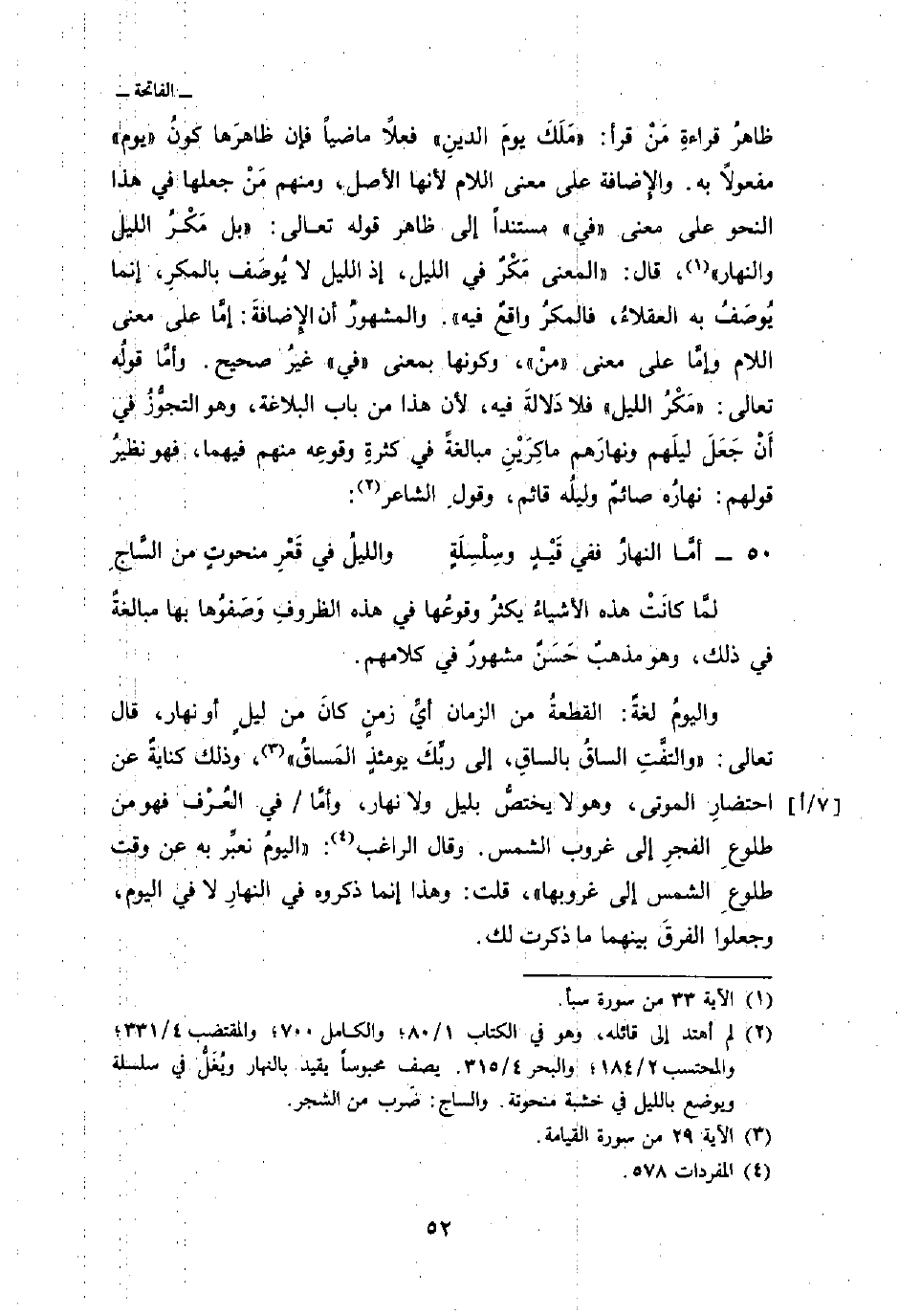 ظاهرُ قراءةِ مَنْ قرأ: «مَلَكَ يومَ الدينِ» فعلاً ماضياً فإن ظاهرَها كونُ «يوم» مفعولاً به. والإضافة على معنى اللام لأنها الأصل، ومنهم مَنْ جعلها في هذا النحو على معنى «في» مستنداً إلى ظاهر قوله تعالى: {بَلْ مَكْرُ اليل والنهار} [سبأ: 33] ، قال: «المعنى مَكْرٌ في الليل، إذ الليل لا يُوصَف بالمكرِ، إنما يُوصَفُ به العقلاءُ، فالمكرُ واقعٌ فيه» . والمشهورُ أن الإِضافةَ: إمَّا على معنى اللام وإمَّا على معنى «مَنْ» ، وكونها بمعنى «في» غيرُ صحيح. وأمَّا قولُه تعالى: {مَكْرُ اليل} فلا دَلالةَ فيه، لأن هذا من باب البلاغة، وهو التجوُّزُ في أَنْ جَعَلَ ليلَهم ونهارَهم ماكِرَيْنِ مبالغةً في كثرةِ وقوعِه منهم فيهما، فهو نظيرُ قولهم: نهارُه صائمٌ وليلُه قائم، وقولِ الشاعر: