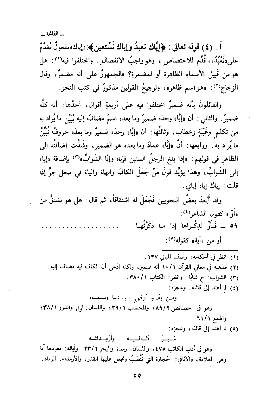 «إياك» مفعولٌ مُقدَّمٌ على «نَعْبُدُ» ، قُدِّم للاختصاصِ، وهو واجبُ الانفصالِ. واختلفوا فيه: هل هو من قَبيل الأسماءِ الظاهرة أو المضمرةِ؟ فالجمهورُ على أنه مضمرٌ، وقال الزجاج: «هو اسم ظاهر» ، وترجيحُ القولين مذكورٌ في كتب النحو.