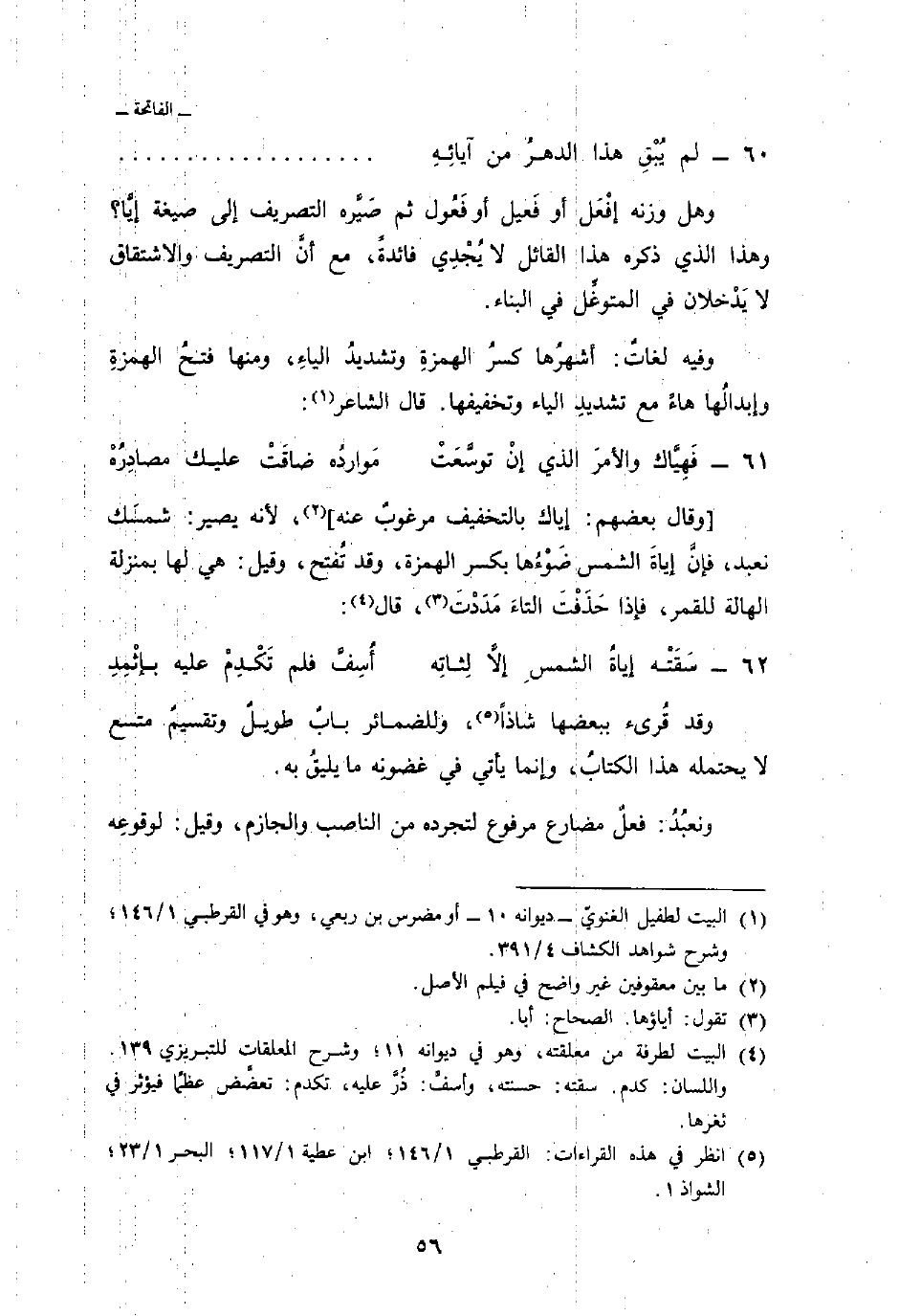 [وقال بعضهم: إياك بالتخفيف مرغوبٌ عنه] ، لأنه يصير «شمسَك نعبد، فإنَّ إياةَ الشمس ضَوْءُها بكسر الهمزة، وقد تُفتح، وقيل: هي لها بمنزلة الهالة للقمر، فإذا حَذَفْتَ التاءَ مَدَدْتَ، قال: