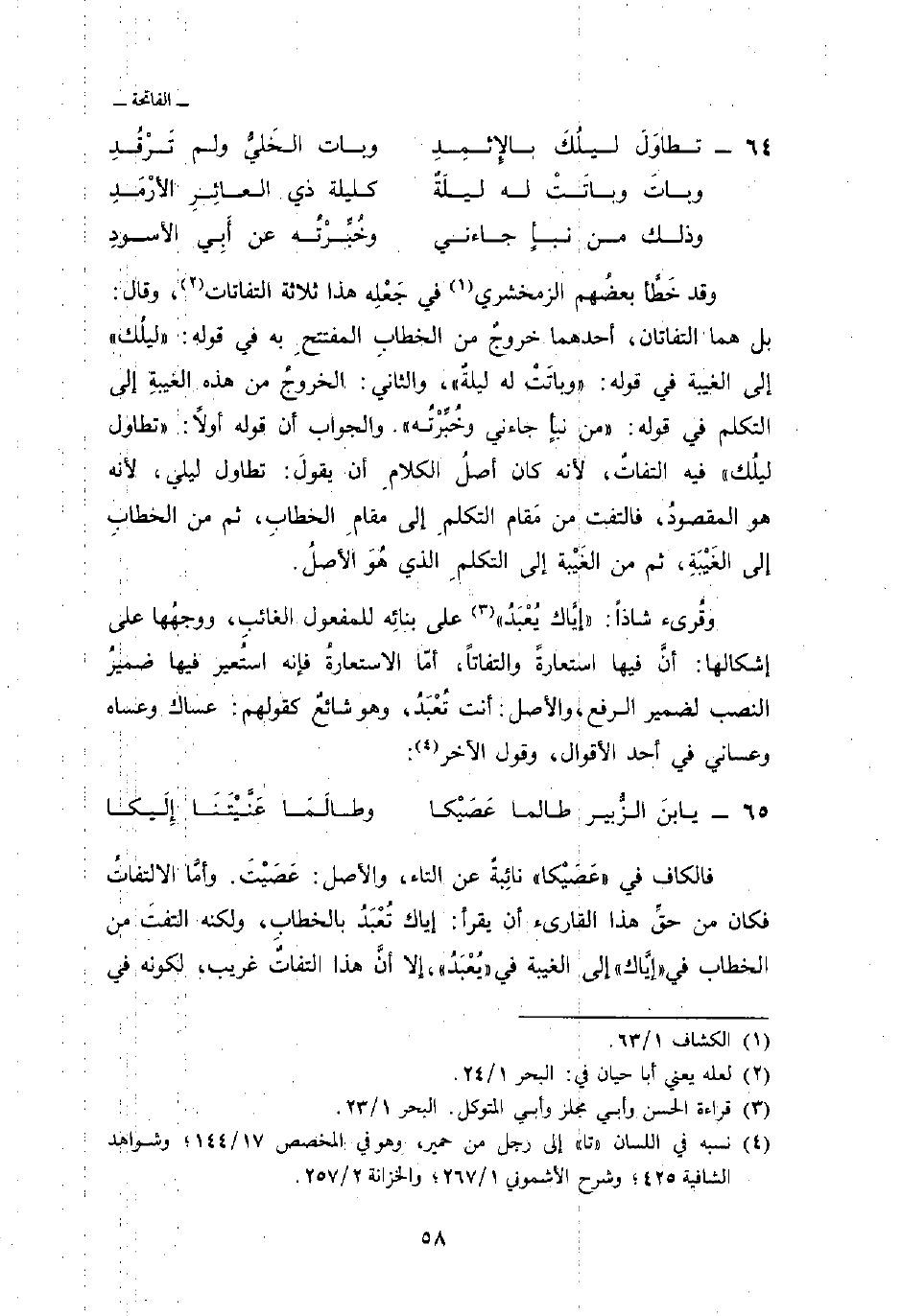 فالكاف في «عَصَيْكا» نائِبةٌ عن التاء، والأصل: عَصَيْتَ. وأمَّا الالتفاتُ فكان من حقِّ هذا القارئ أن يقرأ: إياك تُعْبَدُ بالخطابِ، ولكنه التفتَ من الخطاب في «إيَّاك» إلى الغيبة في «يُعْبَدُ» ، إلا أنَّ هذا التفاتٌ غريب، لكونه في