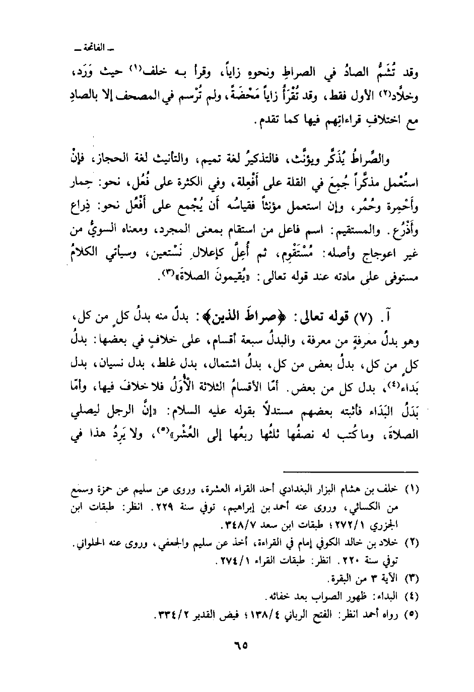 قوله تعالى: {صِرَاطَ الذين} : بدلٌ منه بدلُ كلٍ من كل، وهو بدلُ معرفةٍ من معرفة، والبدلُ سبعة أقسام، على خلافٍ في بعضها، بدلُ كلٍ من كل، بدلُ بعض من كل، بدلُ اشتمال، بدل غلط، بدل نسيان، بدل بَداء، بدل كل من بعض. أمّا الأقسامُ الثلاثة الأُوَلُ فلا خلافَ فيها، وأمّا بَدَلُ البَدَاء فأثبته بعضهم مستدلاً بقوله عليه السلام: «إنَّ الرجل ليصلي الصلاةَ، وما كُتب له نصفُها ثلثُها ربعُها إلى العُشْر» ، ولا يَرِدُ هذا في