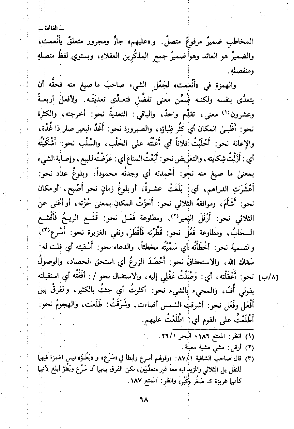 والهمزة في «أَنْعمت» لجَعْلِ الشيء صاحبَ ما صيغ منه فحقُّه أن يتعدَّى بنفسه ولكنه ضُمِّن معنى تفضَّل فتعدَّى تعديَتَه. ولأفعل أربعةٌ وعشرون معنى، تقدَّم واحدٌ، والباقي: التعديةُ نحو: أخرجته، والكثرة نحو: أظبى المكان أي كَثُر ظِباؤه، والصيرورة نحو: أَغَدَّ البعير صار ذا غُدَّة، والإِعانة نحو: أَحْلَبْتُ فلاناً أي أَعَنْتُه على الحَلْب، والسَّلْب نحو: أَشْكَيْتُه أي: أَزَلْتُ شِكايته، والتعريض نحو: أَبَعْتُ المتاعَ أي: عَرَضْتُه للبيع، وإصابة الشيء بمعنى ما صيغ منه نحو: أَحْمدته أي وجدتُه محموداً، وبلوغُ عدد نحو: أَعْشَرَتِ الدراهم، أي: بَلَغَتْ عشرةً، أو بلوغُ زمانٍ نحو أَصْبح، أو مكان نحو: أَشْأَمَ، وموافقهُ الثلاثي نحو: أَحَزْتُ المكانِ بمعنى حُزْته، أو أغنى عن الثلاثي نحو: أَرْقَلَ البعير، ومطاوعة فَعَل نحو: قَشَع الريحُ فَأقْشع السحابُ، ومطاوعة فَعَّل نحو: قَطَّرْته فَأَقْطَرَ، ونفي الغزيرة نحو: أَسْرع، والتسمية نحو: أخْطَأْتُه أي سَمَّيْتُه مخطئاً، والدعاء نحو: أَسْقيته أي قلت له: سَقاك الله، والاستحقاق نحو: أَحْصَدَ الزرعُ أي استحق الحصاد، والوصولُ نحو: أَعْقَلْته، أي: وَصَّلْتُ عَقْلِي إليه، والاستقبال نحو/: أفَفْتُه أي استقبلته بقولي أُفّ، والمجيء بالشيء نحو: أكثرتُ أي جئتُ بالكثير، والفرقُ بين أَفْعَل وفَعَل نحو: أشرقت الشمس أضاءت، وشَرَقَتْ: طَلَعت، والهجومُ نحو: أَطْلَعْتُ على القوم أي: اطَّلَعْتُ عليهم.