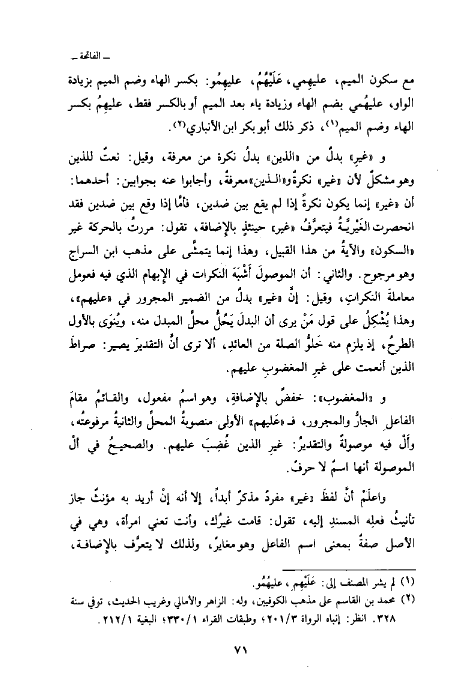 و «غيرِ» بدلٌ من «الذين» بدلُ نكرة من معرفة، وقيل: نعتٌ للذين وهو مشكلٌ لأن «غير» نكرةٌ و «الذين» معرفةٌ، وأجابوا عنه بجوابين: أحدهما: أن «غير» إنما يكون نكرةً إذا لم يقع بين ضدين، فأمَّا إذا وقع بين ضدين فقد انحصرت الغَيْريَّةُ فيتعرَّفُ «غير» حينئذٍ بالإِضافة، تقول: مررتُ بالحركة غير «السكون» والآيةُ من هذا القبيل، وهذا إنما يتمشَّى على مذهب ابن السراج وهو مرجوح. والثاني: أن الموصولَ أَشْبَهَ النكرات في الإِبهام الذي فيه فعومل معاملةَ النكراتِ، وقيل: إنَّ «غير» بدلٌ من الضمير المجرور في «عليهم» ، وهذا يُشْكِلُ على قول مَنْ يرى أن البدلَ يَحُلُّ محلَّ المبدل منه، ويُنوَى بالأول الطرحُ، إذ يلزم منه خَلوُّ الصلة من العائدِ، ألا ترى أنَّ التقديرَ يصير: صراطَ الذين أنعمت على غيرِ المغضوبِ عليهم.