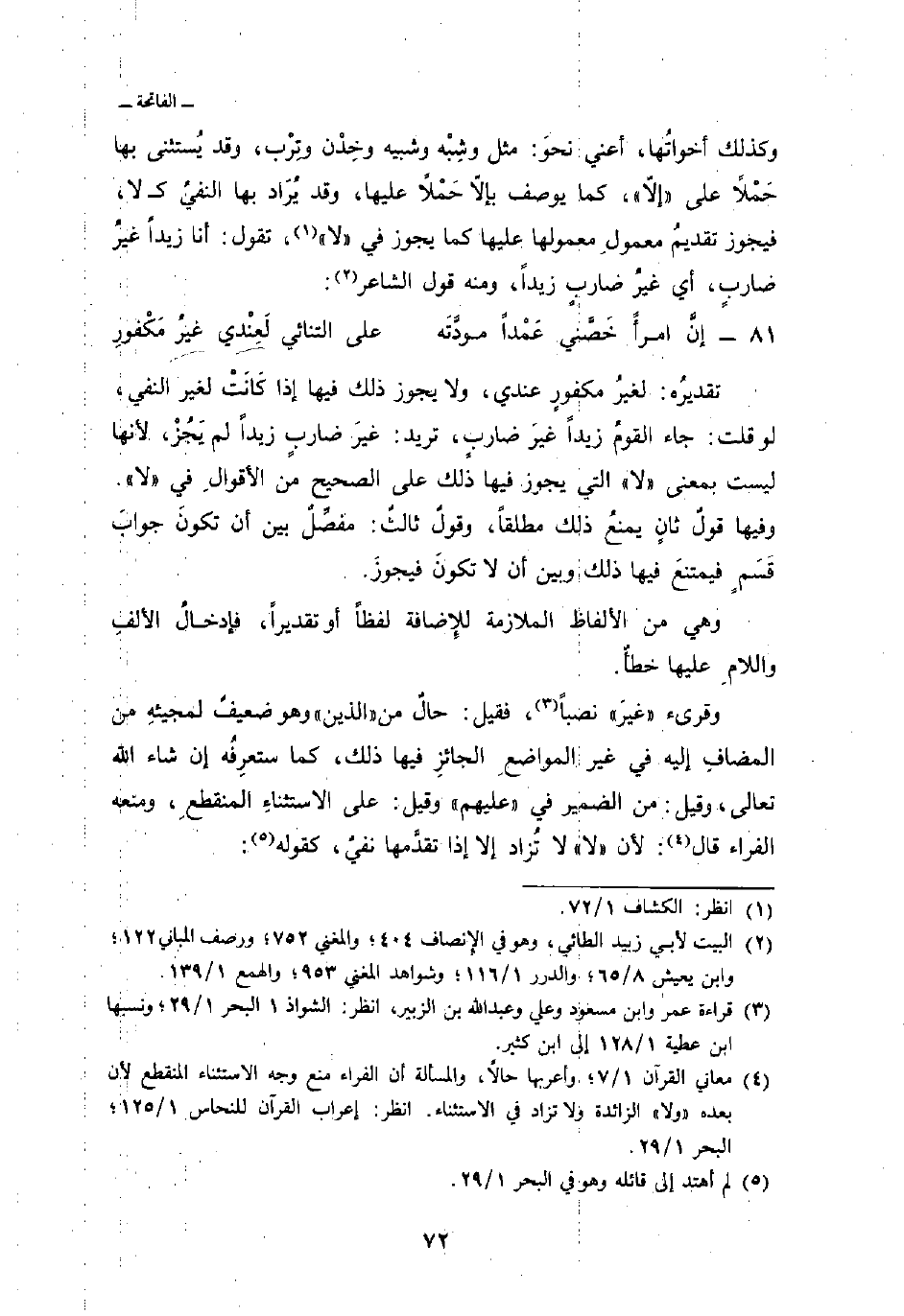 وكذلك أخواتُها، أعني نحوَ: مثل وشِبْه وشبيه وخِدْن وتِرْب، وقد يُستثنى بها حَمْلاً على «إلاّ» ، كما يوصف بإلاّ حَمْلاً عليها، وقد يُرَاد بها النفيُ ك لا، فيجوز تقديمُ معمولِ معمولها عليها كما يجوز في «لا» تقول: أنا زيداً غيرُ ضاربٍ، أي غير ضاربٍ زيداً، ومنه قول الشاعر: