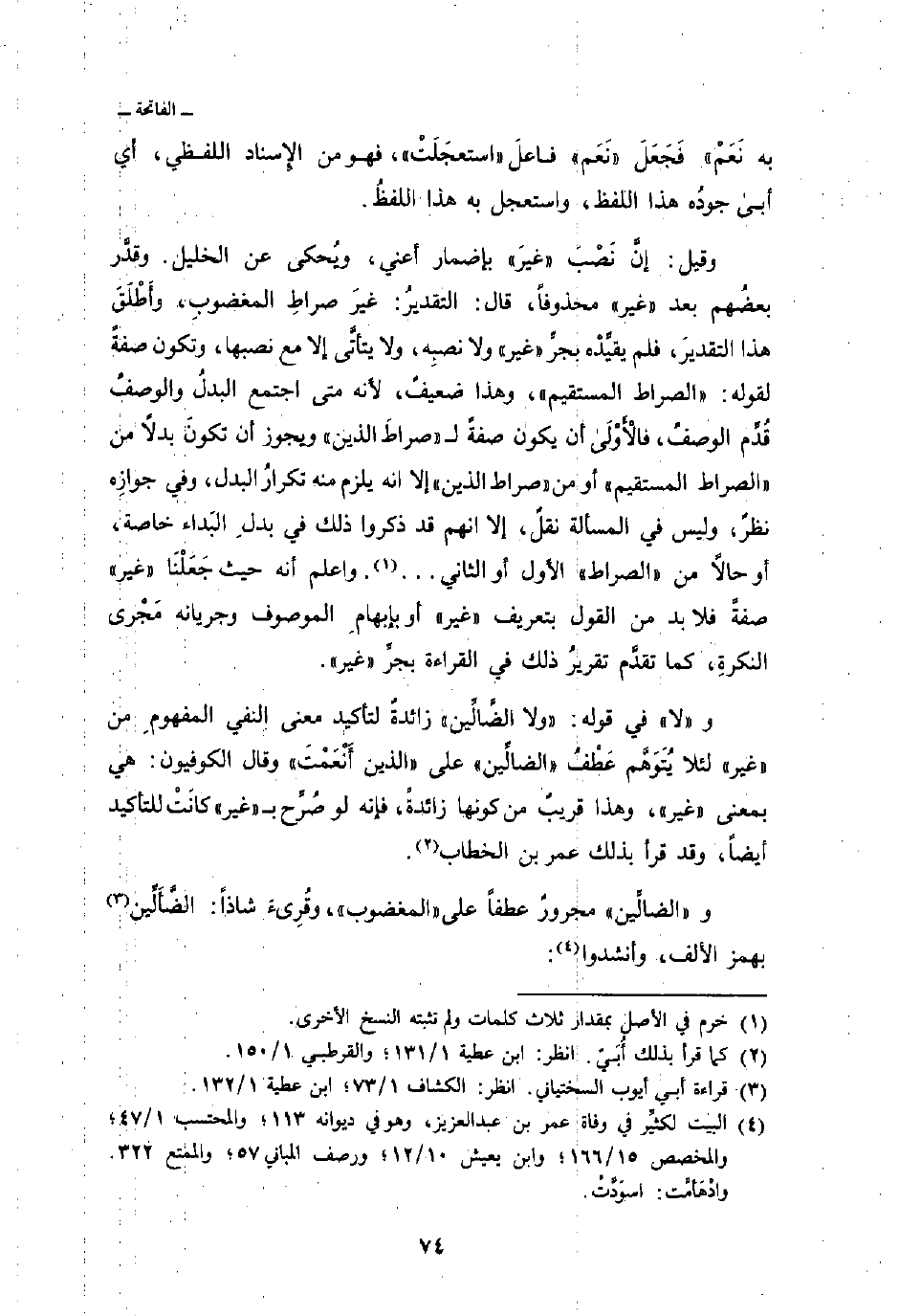 وقيل: إنَّ نَصْبَ «غيرَ» بإضمار أعني، ويُحكى عن الخليل. وقدَّر بعضُهم بعد «غير» محذوفاً، قال: التقديرُ: غيرَ صراطِ المغضوبِ، وأَطْلَقَ هذا التقديرَ، فلم يقيِّدْه بجرِّ «غير» ولا نصبِه، ولا يتأتَّى إلا مع نصبها، وتكون صفةً لقوله: {الصراط المستقيم} ، وهذا ضعيفٌ، لأنه متى اجتمع البدلُ والوصفُ قُدِّم الوصفُ، فالأولى أن يكون صفةً ل «صراطَ الذين» ويجوز أن تكونَ بدلاً من {الصراط المستقيم} أو من {صِرَاطَ الذين} إلا انه يلزم منه تكرارُ البدل، وفي جوازِه نظرٌ، وليس في المسألة نقلٌ، إلا انهم قد ذكروا ذلك في بدلِ البَداء خاصة، أو حالاً من «الصراط» الأول أو الثاني.