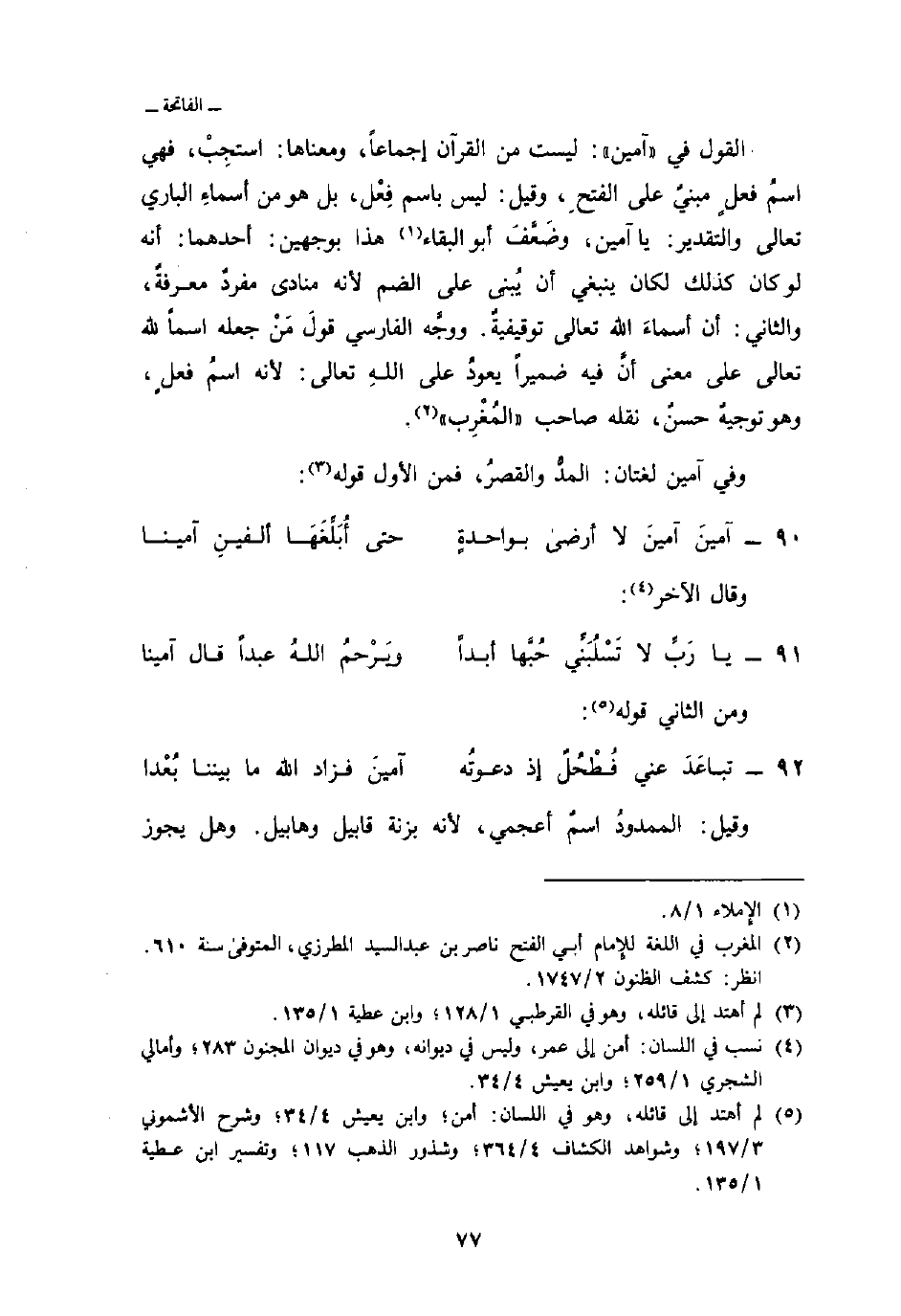 القول في «آمين» : ليست من القرآن إجماعاً، ومعناها: استجِبْ، فهي اسمُ فعلٍ مبنيٌ على الفتحِ، وقيل: ليس باسم فِعْل، بل هو من أسماءِ الباري تعالى والتقدير: يا آمين، وضَعَّفَ أبو البقاء هذا بوجهين: أحدهما: أنه لو كان كذلك لكان ينبغي أن يُبنى على الضم لأنه منادى مفردٌ معرفةٌ، والثاني: أن أسماءَ الله تعالى توقيفيةٌ. ووجَّه الفارسي قولَ مَنْ جعله اسماً لله تعالى على معنى أنَّ فيه ضميراً يعودُ على اللهِ تعالى: لأنه اسمُ فعلٍ، وهو توجيهٌ حسنٌ، نقله صاحب «المُغْرِب» .